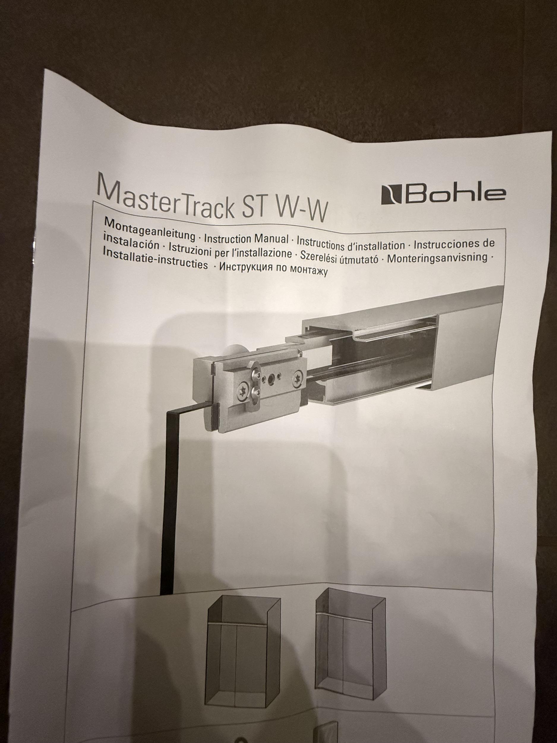 8mm kirgas karastatud klaas, siinide komplekt (Bohle MasterTrack st w-w), liugukse käepide, tihendid.