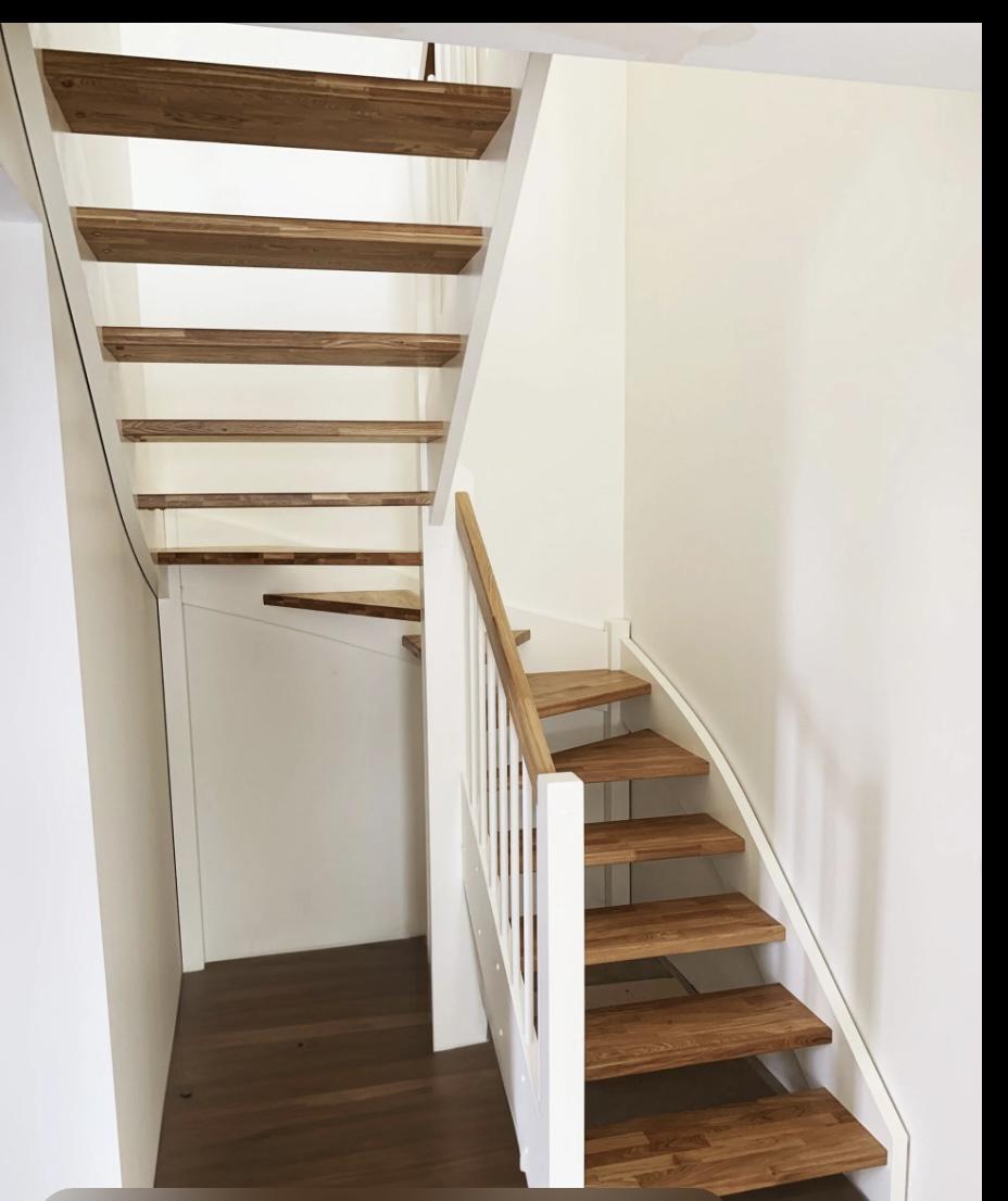 Sõrmjätk tamme astmed õlitatud, Käsipuu tammest .Põsed ja piirded valged.Ilma varba lauata õhuline siksak põsepuu. Koos paigaldusega viimistletud trepp .Led sooned sisse freesitud. Kindlasti tuleb enne tulla koha peale ja täpselt üle mõõta ja läbi rääkida. Eestis ja soomes treppe teinud üle 30 aasta. Tõõdega saame alustada koheselt. Paigaldus max 30 päeva jooksul