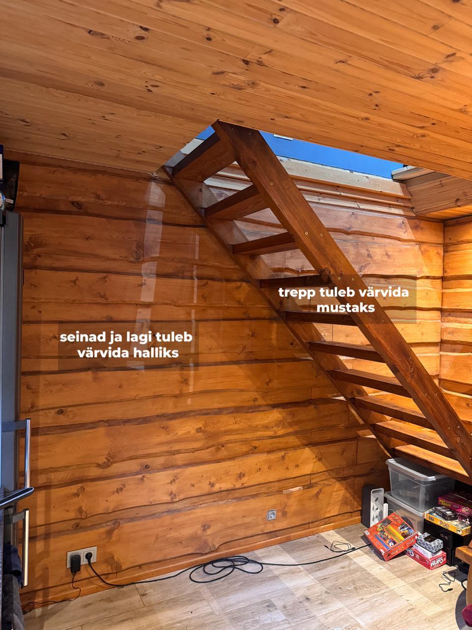 - Ning see järel värvida seinad (ca 17m2) ja lagi (ca 16m2) halli mattpuiduvärviga.