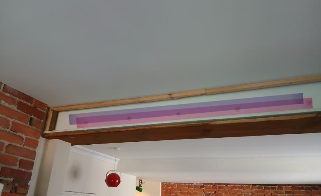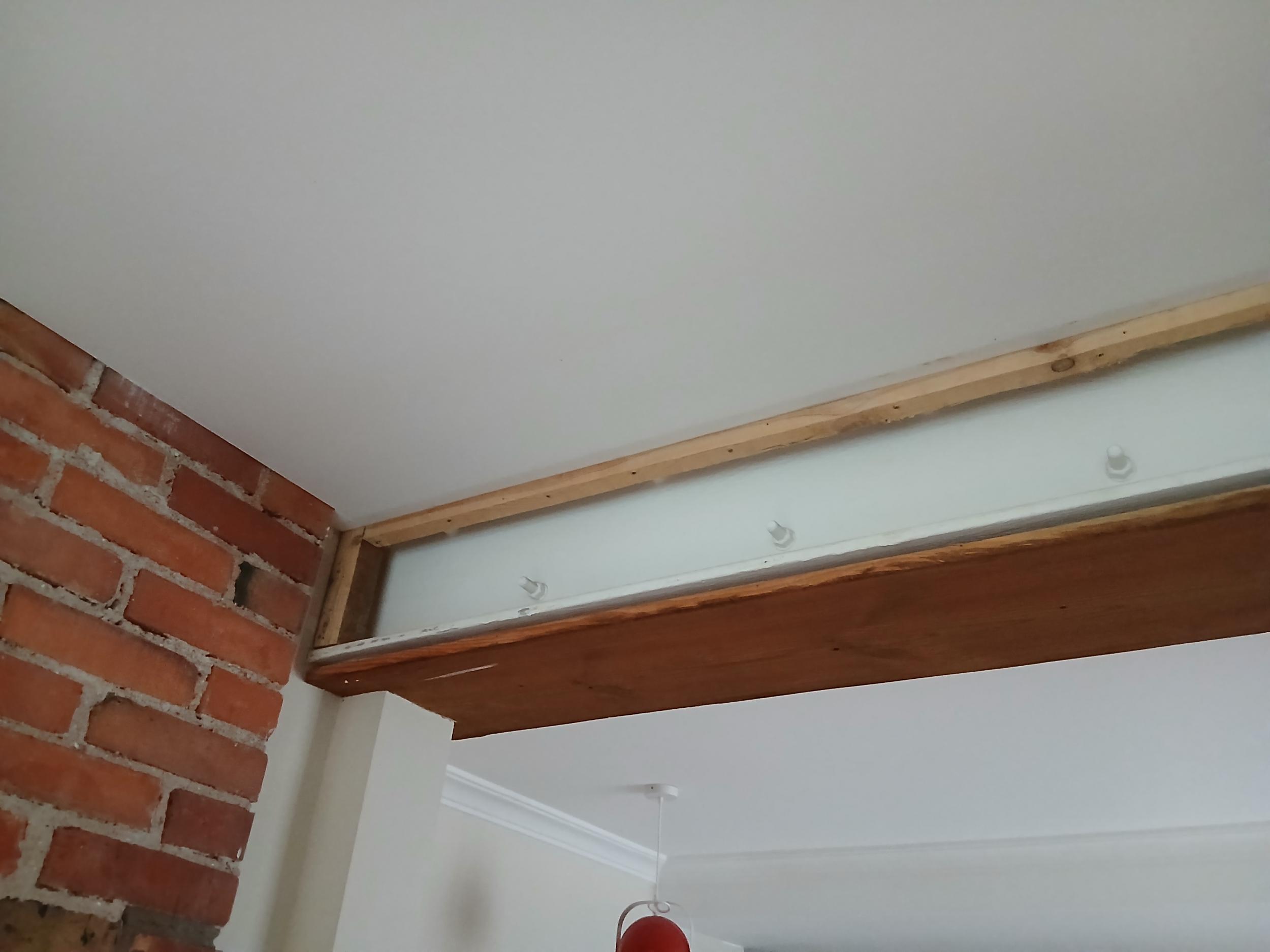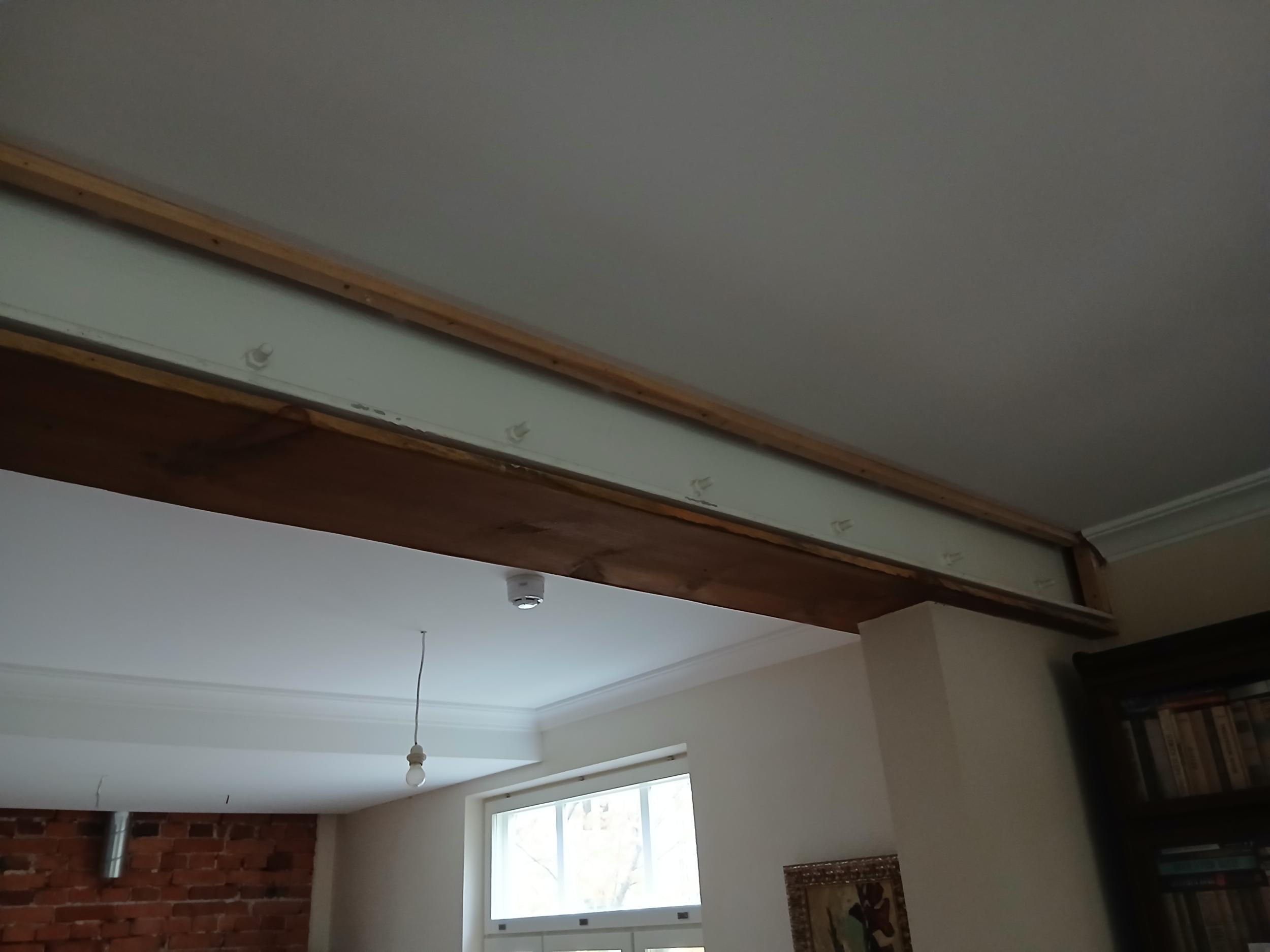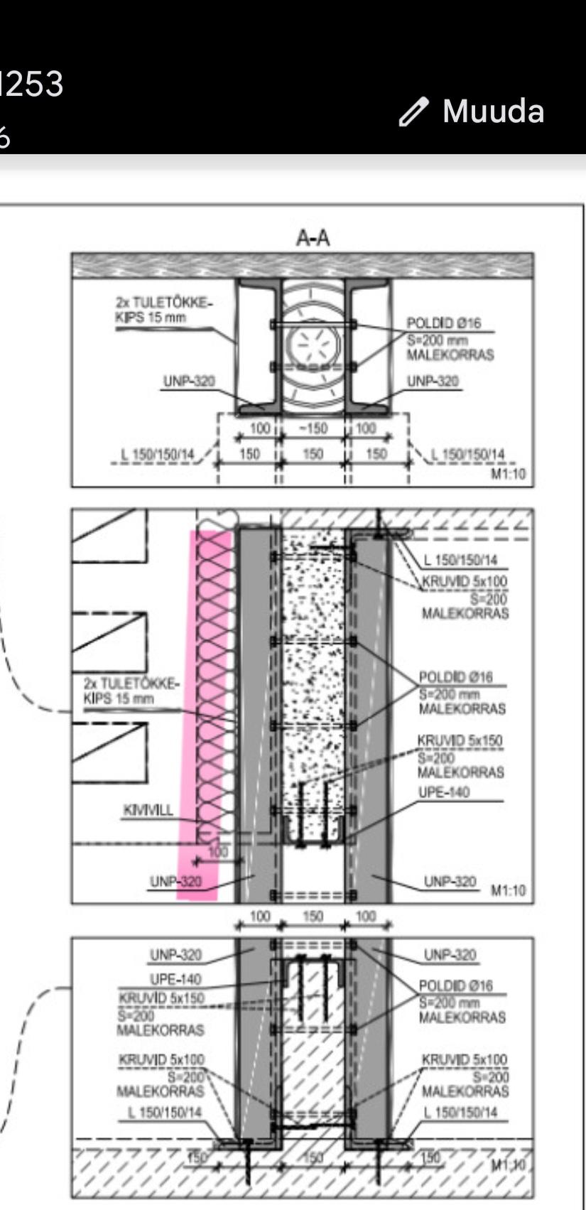 5 m pikkuse silluse ümbert ära võtta laudis ja utiliseerida ning asendada 2x tuletõkkekipsiga, metalltala ja korstna vahe täita kivivillaga ja samuti U tala õõnsused (pildil punasega). Kipsikonstruktsioon viimistleda- pahteldada ja värvida ca 2x.
