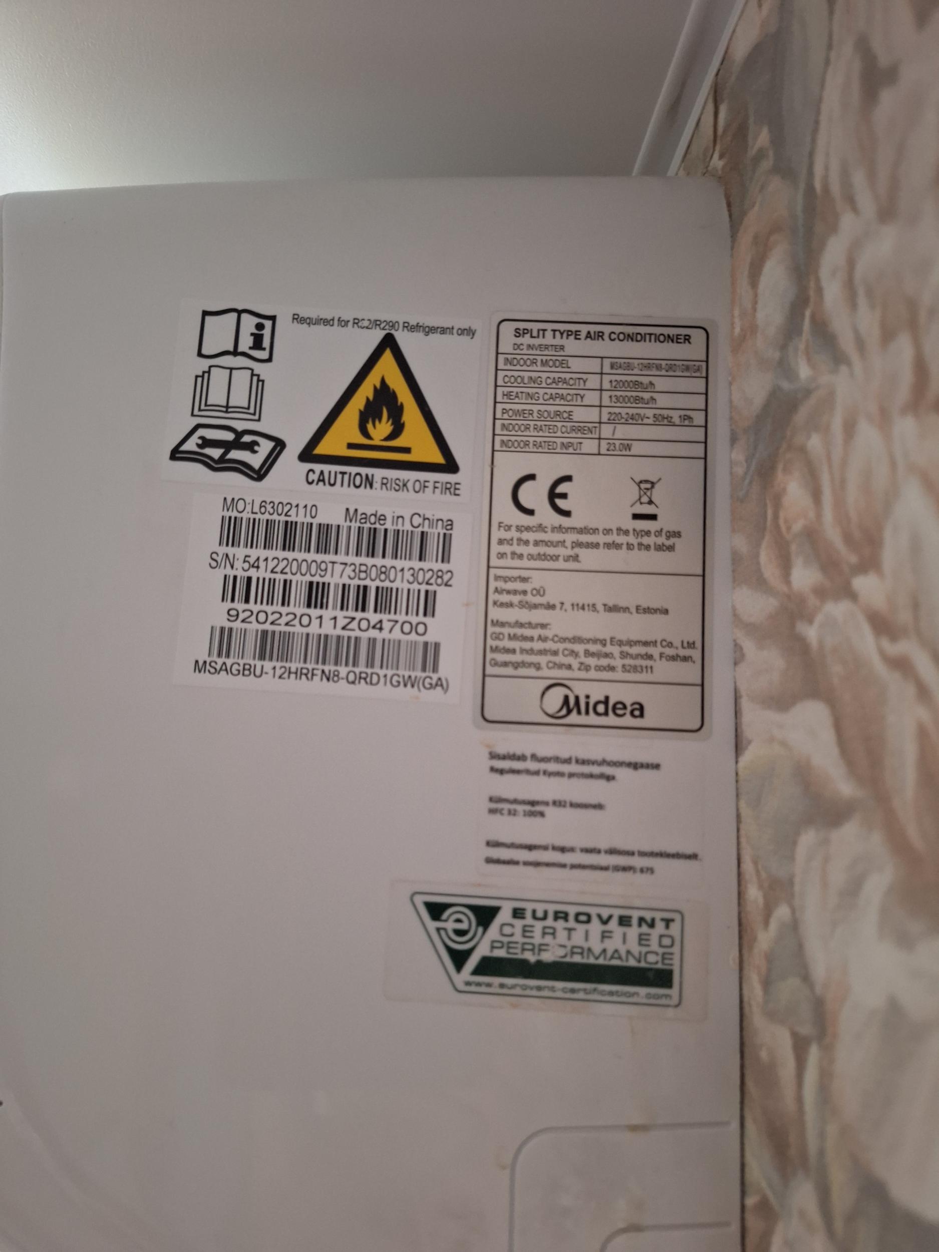 Paigaldatud on õhksoojuspump Midea, 1 siseosa (paigaldatud seinale elutuppa), 1 väliosa (paigaldatud kahekordse maja tagaküljele, seinale), elektriühendus tehtud korterisisesesse kilpi, pumbal eraldiseisev kaitse. Kondensaatvee äravool on ühendatud väliosas juurest välja