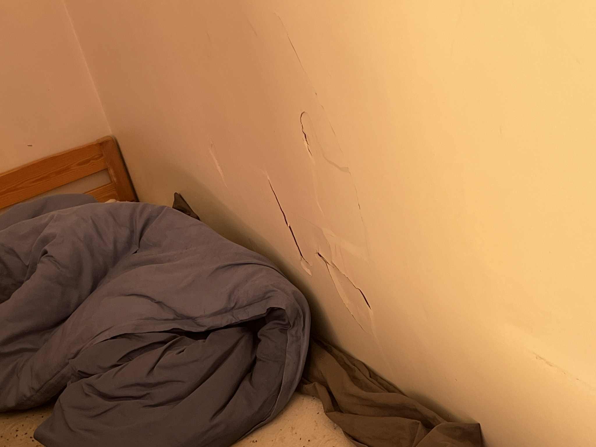 Objekt asub liftita viiekordse maja viimasel korrusel. Vigastused on kolmes seinas, sh. ühes seinas kõige suuremad (voodiga foto). Kipsi parandustööd, pahteldus, värvimine. Seinte kaitseks laminaadi paigaldamine voodi otsa- ja tagaseina, maast ca 1m kõrguseni, 100 + 200 cm pikkuselt.