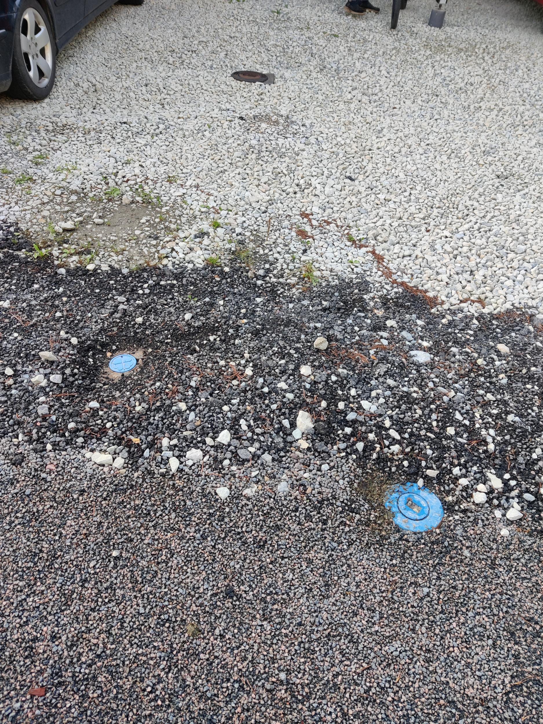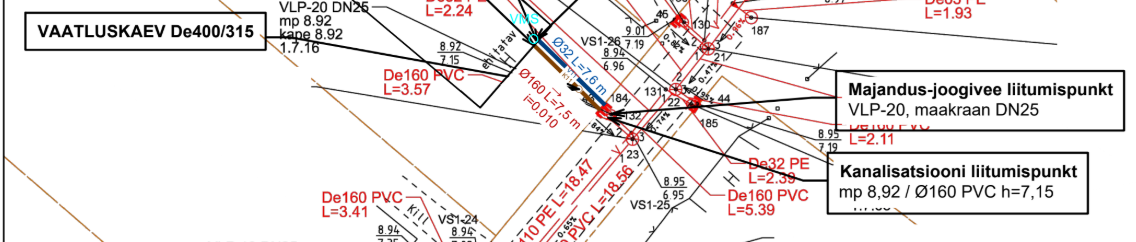 Pildil on olemasolev kanalisatsioonitoru kolmikliitmikuga(pildil kõige ülemine)(üks tuleb majast, teine läheb vasakule mahutisse ja kolmas ootab ühendamist uue kanalisatsiooniga pildil vasakpoolne sinine liitumispunkt). Samuti on vaja vesi vanast liitumispunktist (parempoolne vana vesi liitumispunktist) uude suunata. Torutööd umbes 4 meetrit.