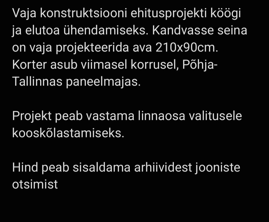 hinnapakkumine sisaldab korteri rekonstrueerimisprojekti koostamist koos ehitusteatise taotlemisega KOVist. Oleme käesoleval aastal menetlenud üle 50 analoogse töö, mistõttu omame piisavat kogemust. |