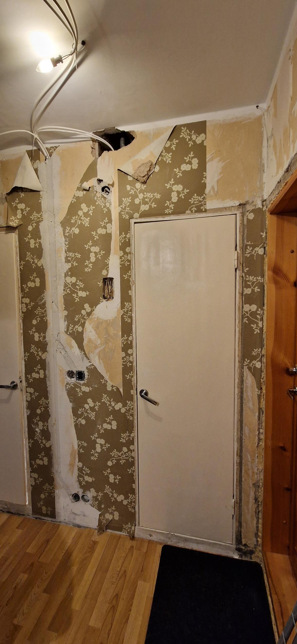 - Elektripistikute jaoks aukude tegemine (2tk 110cm kõrgusele kraanikausi juurde, 2tk pesumasina taha, 1tk peegelkapi taha/sisse) ja elektrikaablite vedu ning pistikute ja põrandakütte termostaadi paigaldus(uued kaablid on juba veetud karbi pealt)