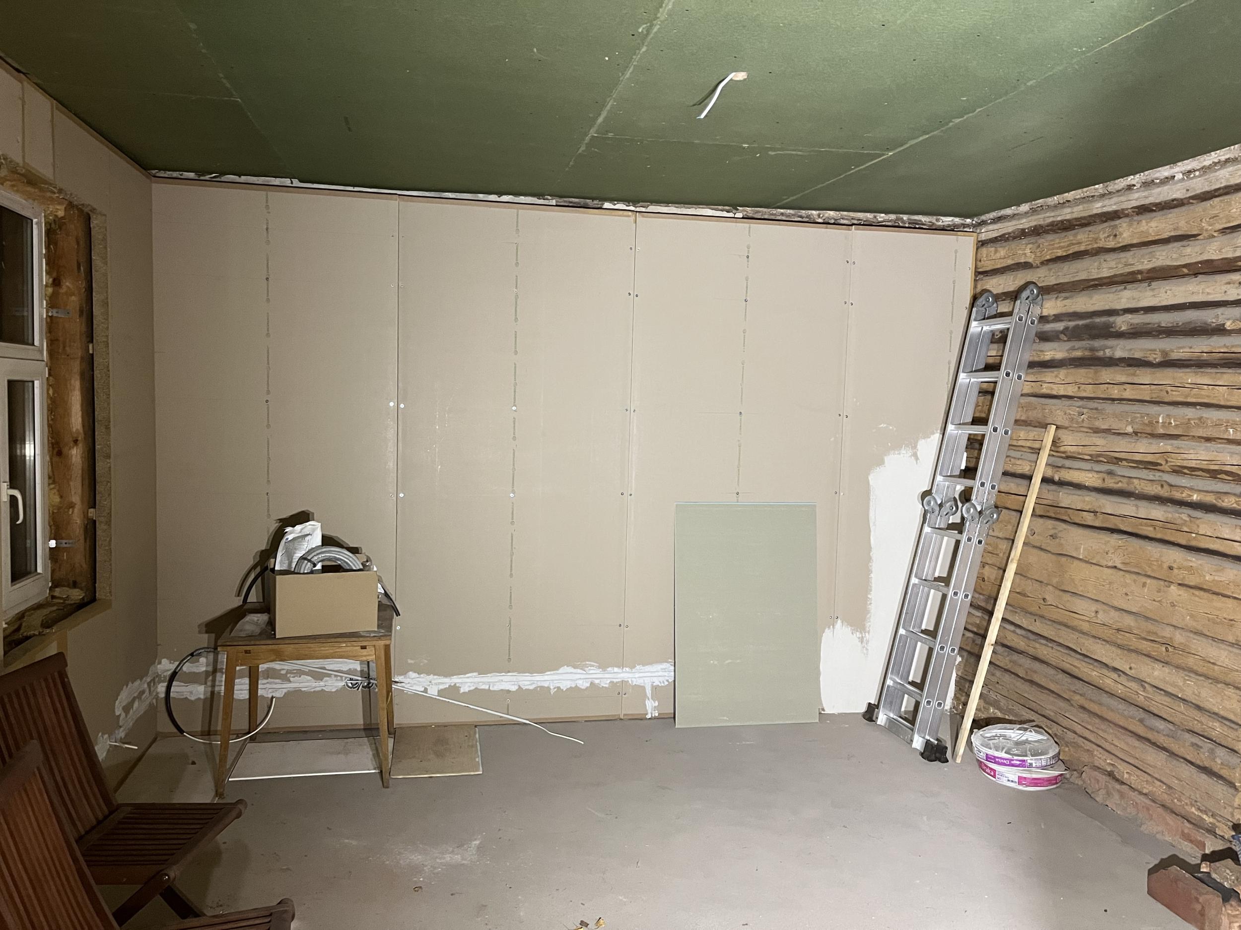 Seintes põhuplaat ca 42m2 (vähemalt plaadivahed vaja armeerida) ja palksein ca 23m2 (krohvimatt vajalik). Seintesse lubikrohv.