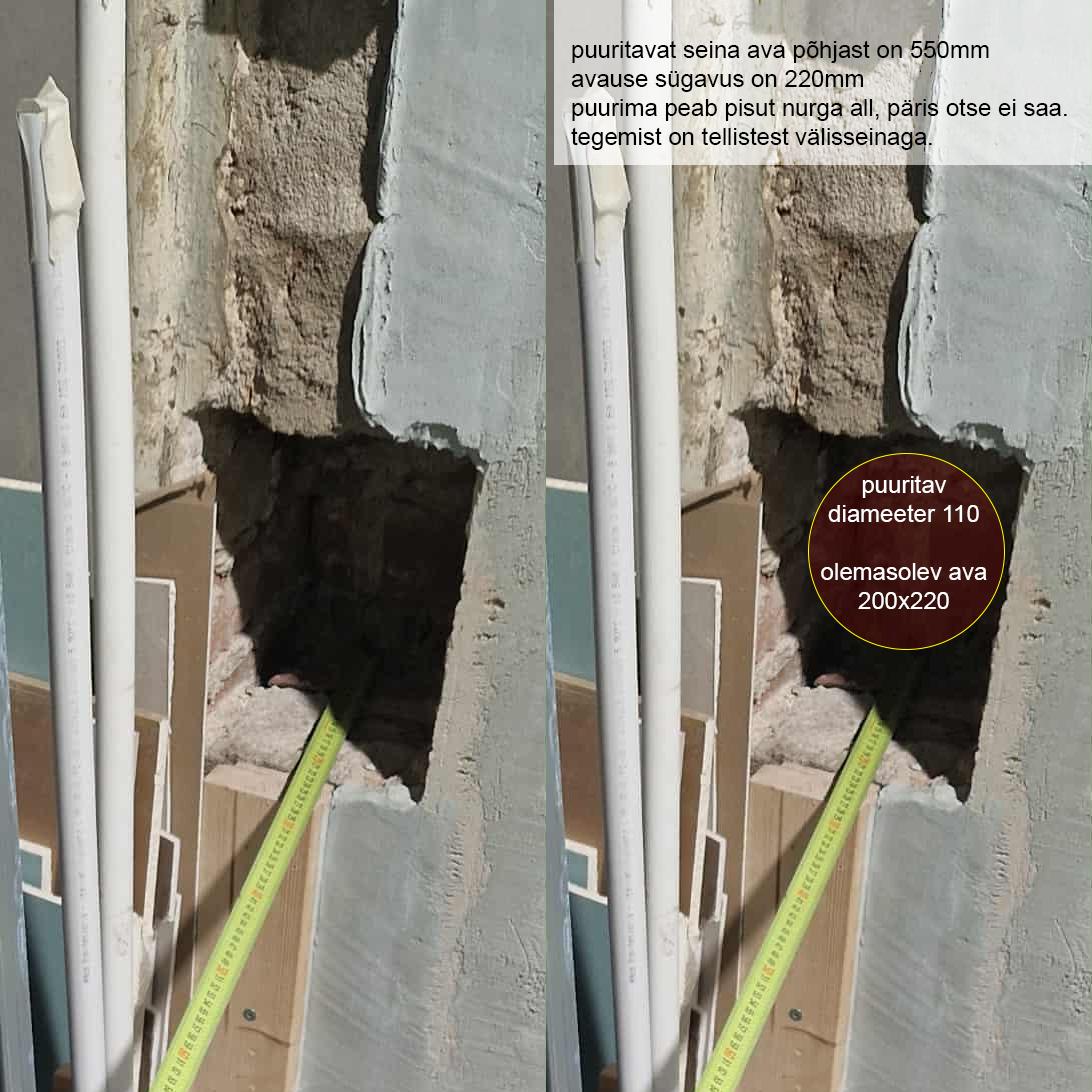 Tarvis puurida 550mm paksusest telliskivi välisseinast läbi avaus diameetriga 110mm. Kogu seina paksus on ca 780mm, ruumis sees on avaus sügavusega 220mm ja sealt edasi jääb puuritavaks paksuseks 550mm. Puurida ei saa päris otse, tuleb pisut nurga all aga avause suurust ja suhteliselt väikest nurka arvestades ei tohiks see probleem olla.