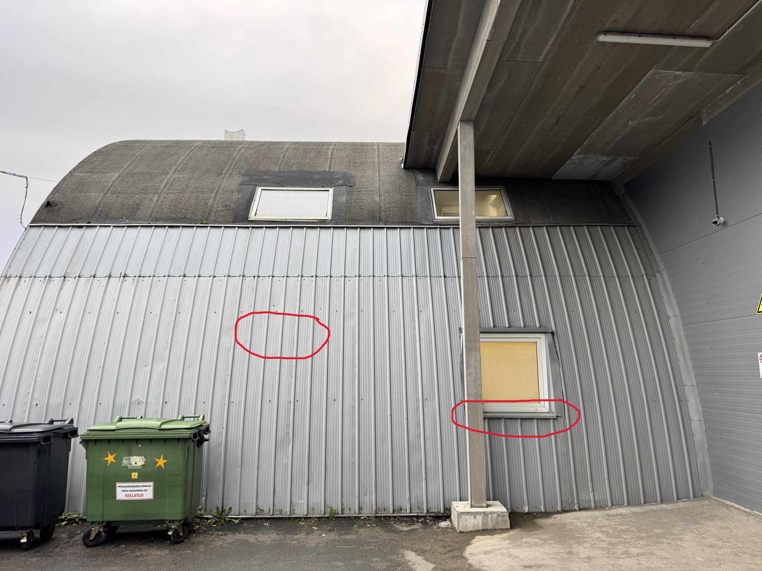 Kahel fotol on punasega märgitud kohad, kust vesi ruumi pääseb. Kust alguse saab, pole teada. Töö sobivusel oleks tarvis teha defekteerimine ja plaan, milline remont on otstarbekas. Palun indikatiivset hinda defekteerimisele ja võimalikule remondile. Kui on otstarbekas teha tunnipõhiselt, siis palun tunni maksumus ja eeldatav ajakulu. Samuti tõstevahendite kulu.