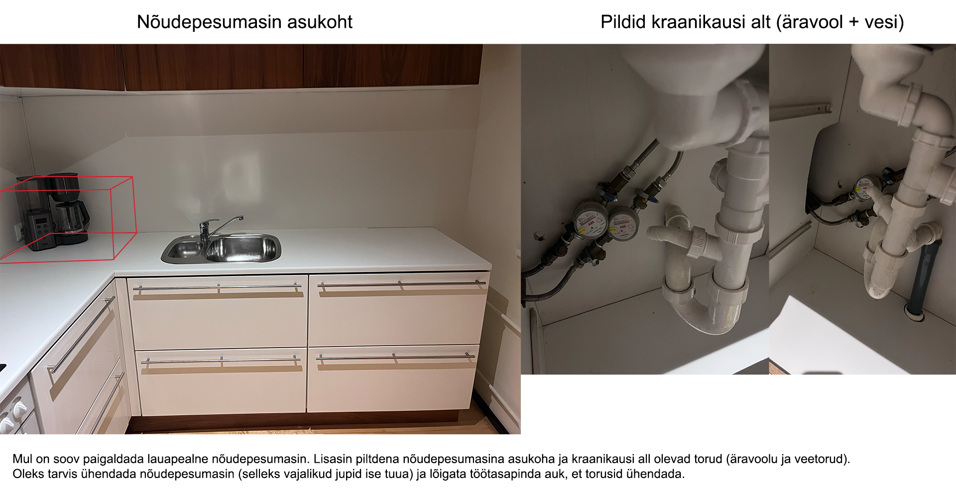 Mul on soov paigaldada lauapealne nõudepesumasin. Lisasin piltdena nõudepesumasina asukoha ja kraanikausi all olevad torud (äravoolu ja veetorud).