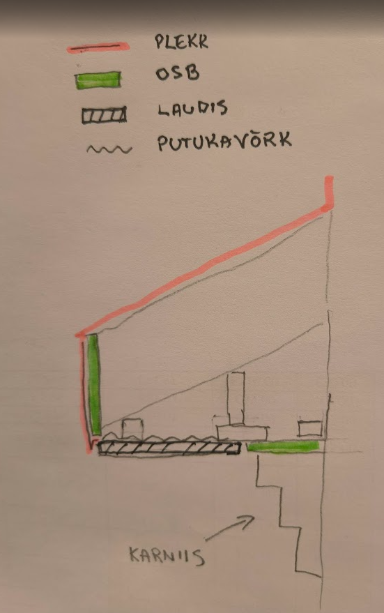 - Tuulekasti eskiis on lisatud piltide alla. Eskiisil on märgitud ka karniis, mis tuleb tuulekasti alla, kuid karniis paigaldatakse hiljem fassaaditööde käigus (materjaliks penoplast, mis hiljem krohvitakse).