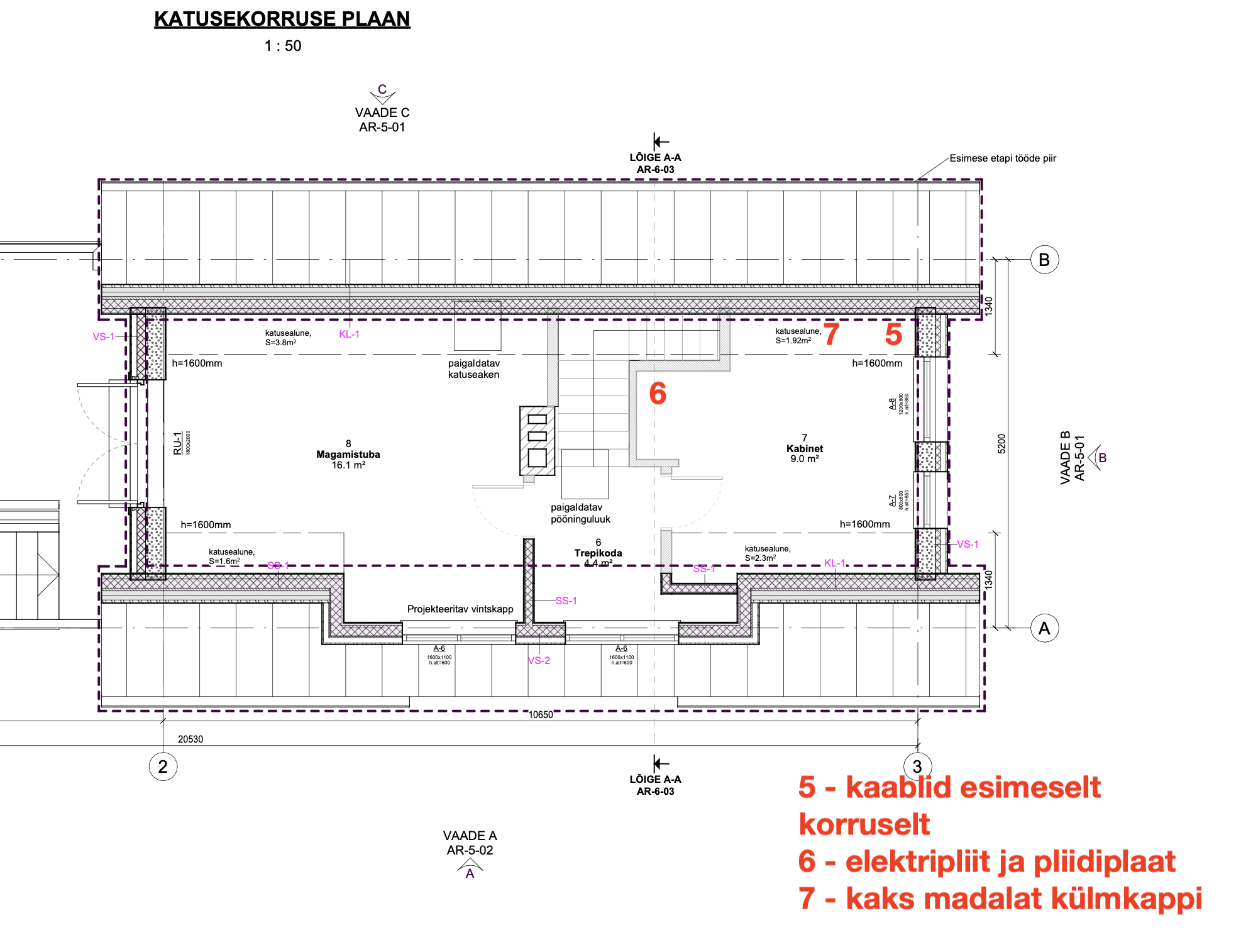 2. Uuest kilbist tuleb vedada uued kaablid teisele korrusele kööki, kuhu on planeeritud elektriahi, pliit, kaks külmkappi, ning edasi elutuppa (pistikud ja valgustus).