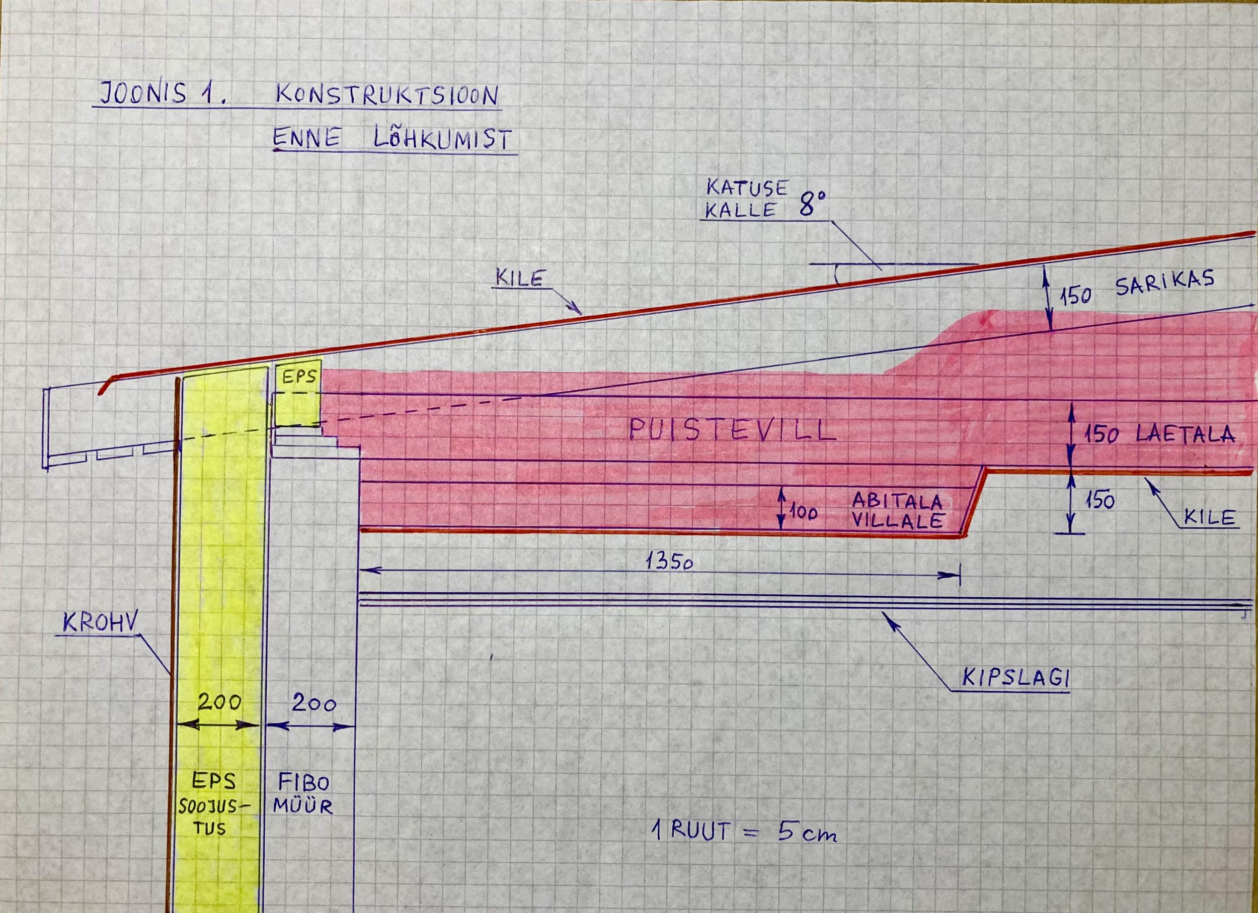 11 aastat tagasi valminud 2-korruseline ridaelamu, müürid laotud 200 mm Fibo plokkidest, soojustatud 200 mm EPS-iga ja krohvitud. Profiilplekkkatus ühepoolse 8-kraadise kaldega. 2. korruse kipsplaatlae karkass kinnitub puittaladele.Lae soojustuseks puistevill. Kuna pööningu madalaimas osas on villa jaoks ruumi vaid 39 cm (aluskilest katusekileni) ja puuduvad tuulesuunajad, siis sellel poolel ei ole pööningul katuse aluskile all tuulutusavasid. Tuulutus toimub katuses oleva tuuluti ja katuse kõrgemas räästas olevate pilude kaudu.