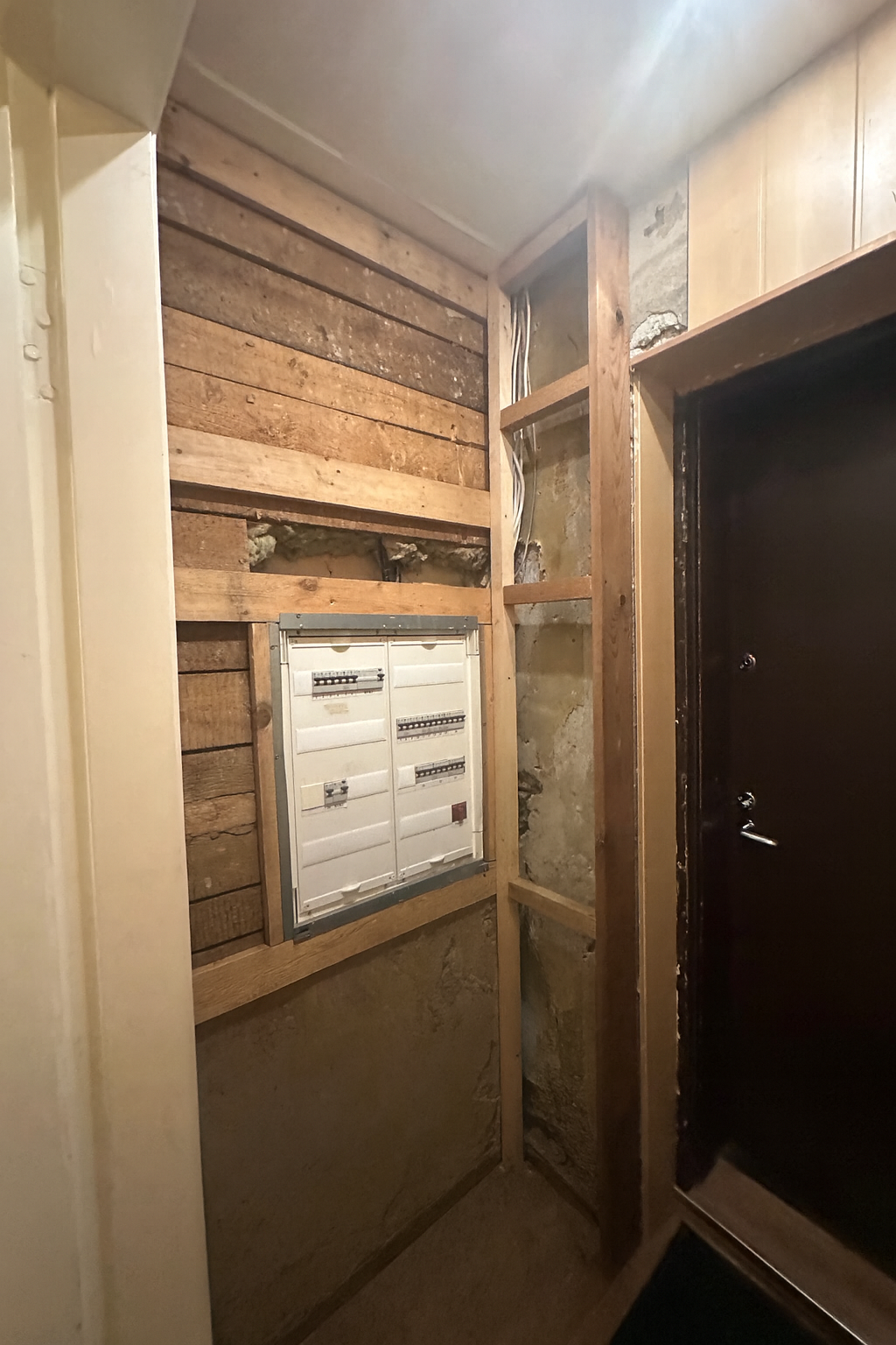 teisele poole seina (pildil elektrikilp) kas kips või puitlaastplaat, hiljem tulevad seina riiulid ning uksed ette (ei ole antud töödesse arvestatud, ehk eraldi).