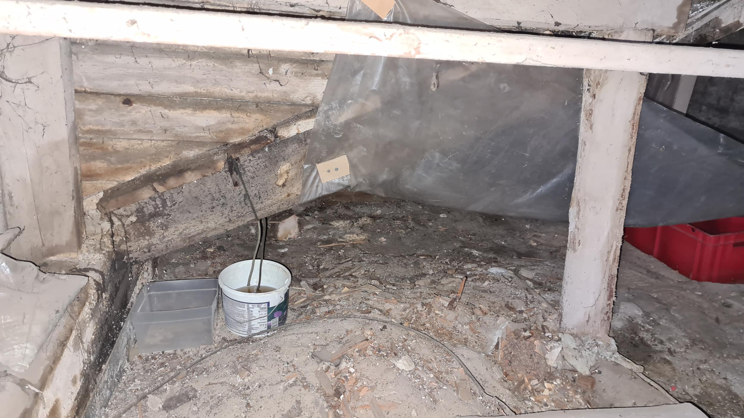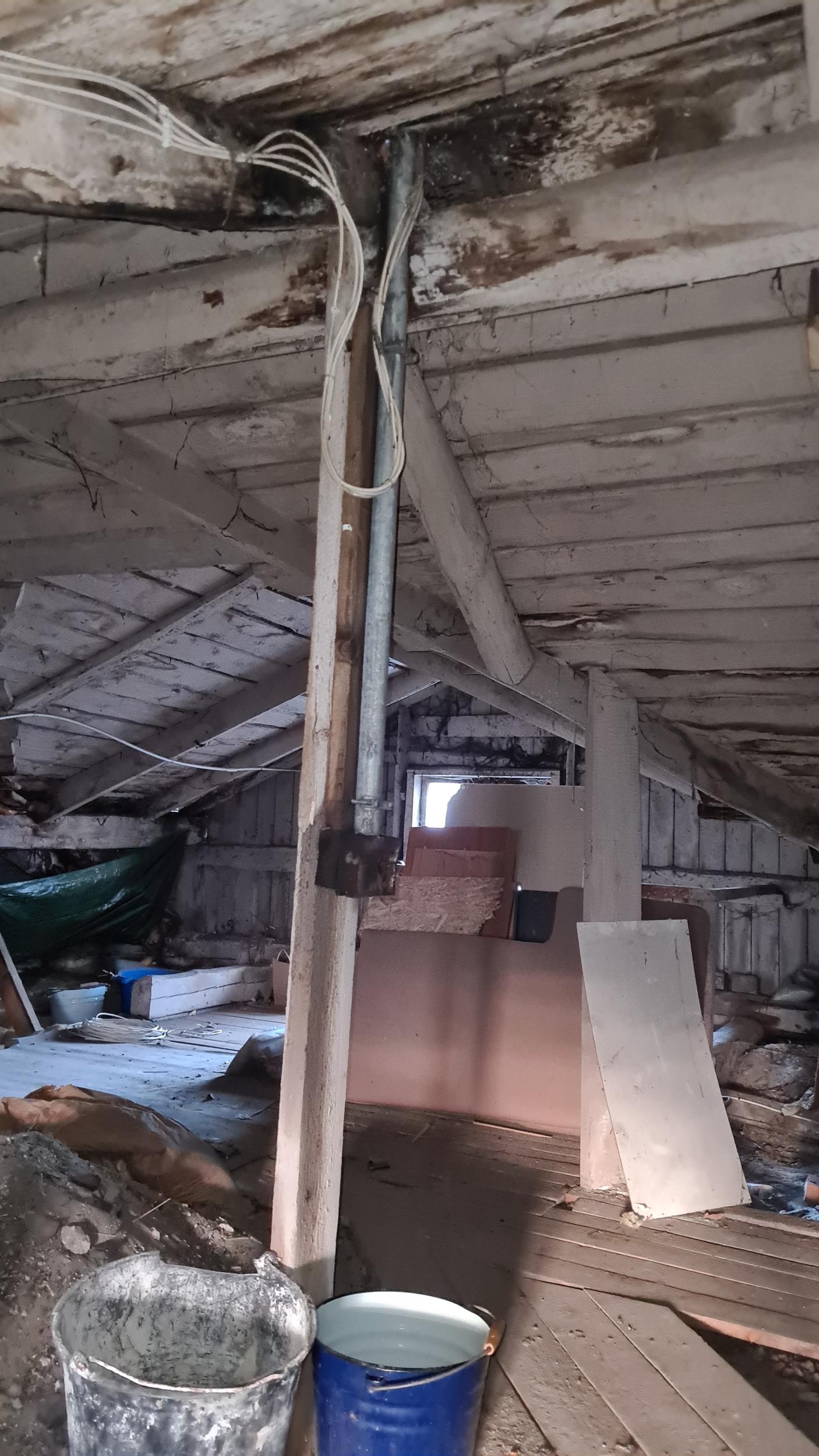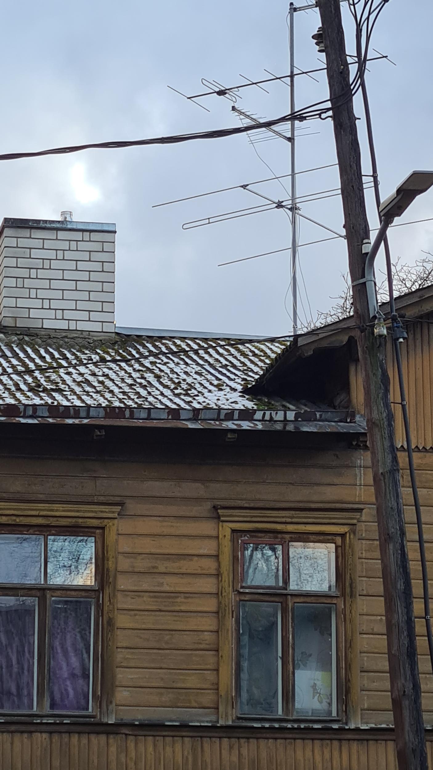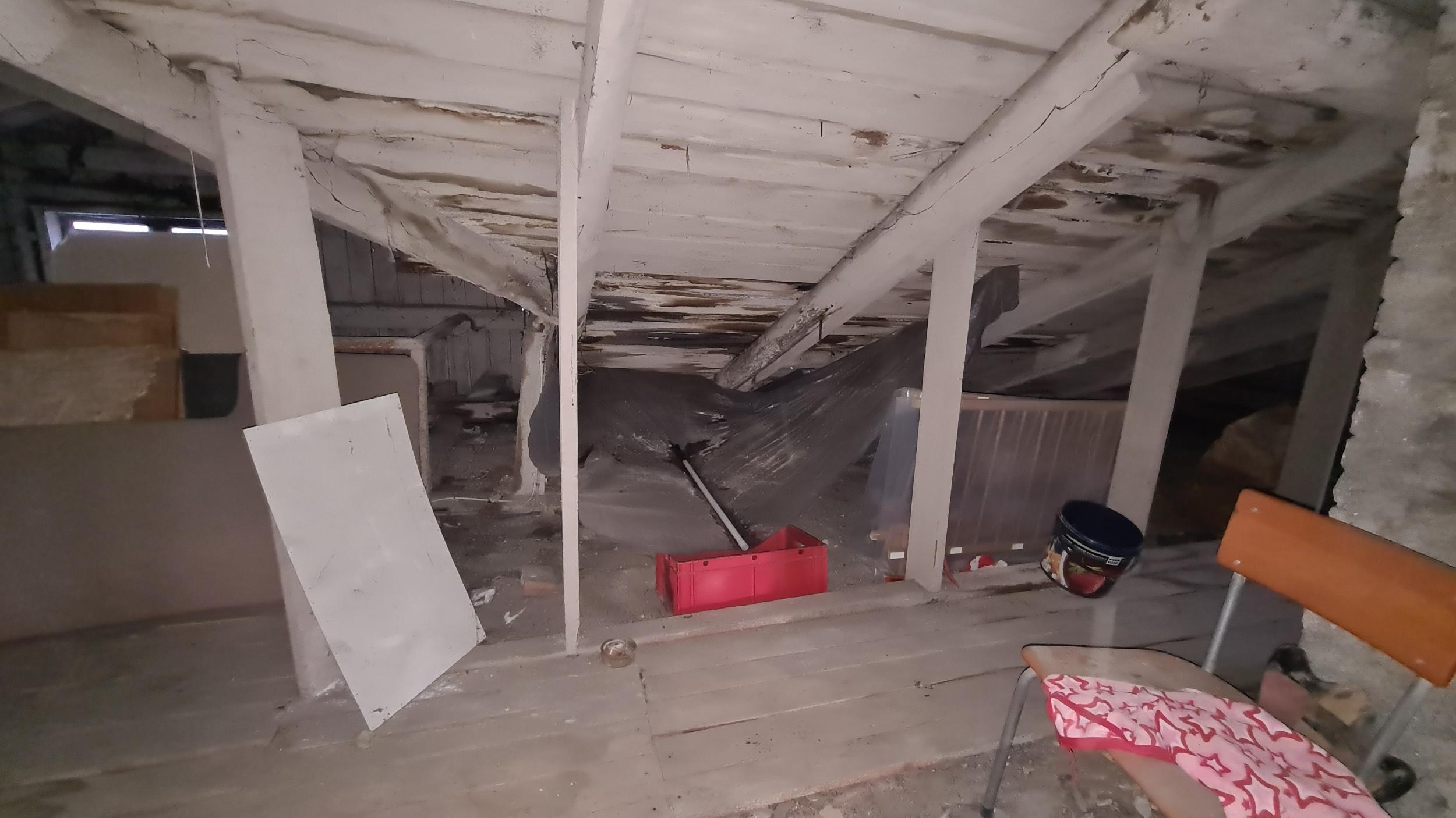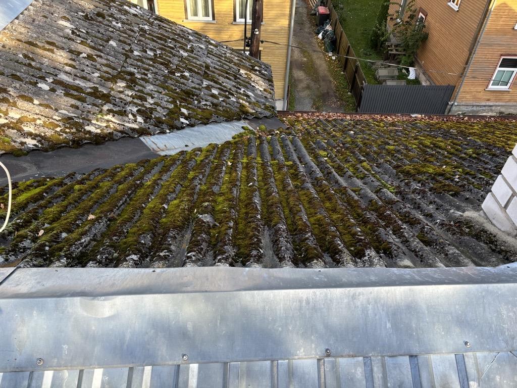 Lekke likvideerimine remondi ootel maja katuselt. Üks läbijooksu koht on antenni ümbrus. Ilmselt saab parandada kummi mansetiga katuselt. Mansett kinnitada ümber antenni. Teine - katuse ja vintskapi neelu pleki vahelt, mööda sarikat alla. Ehk saab hakkama tõstukit kasutamata. Vihma saju ajal läbijooksu koha leidmine on kõige tõenäolisem. Suuri kulutusi ei soovi teha.