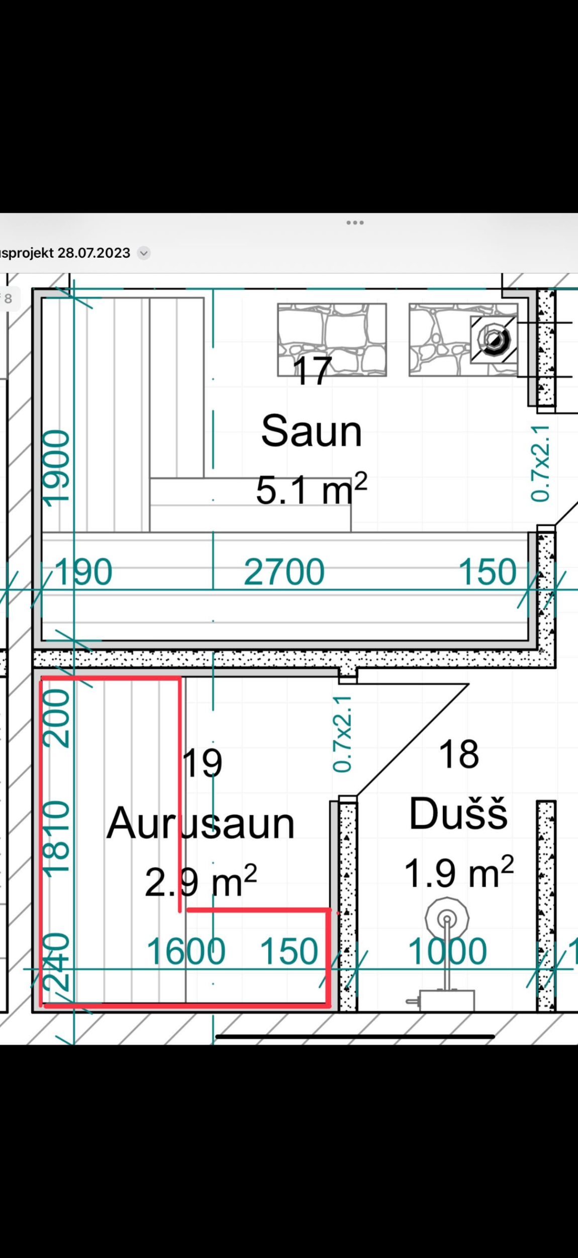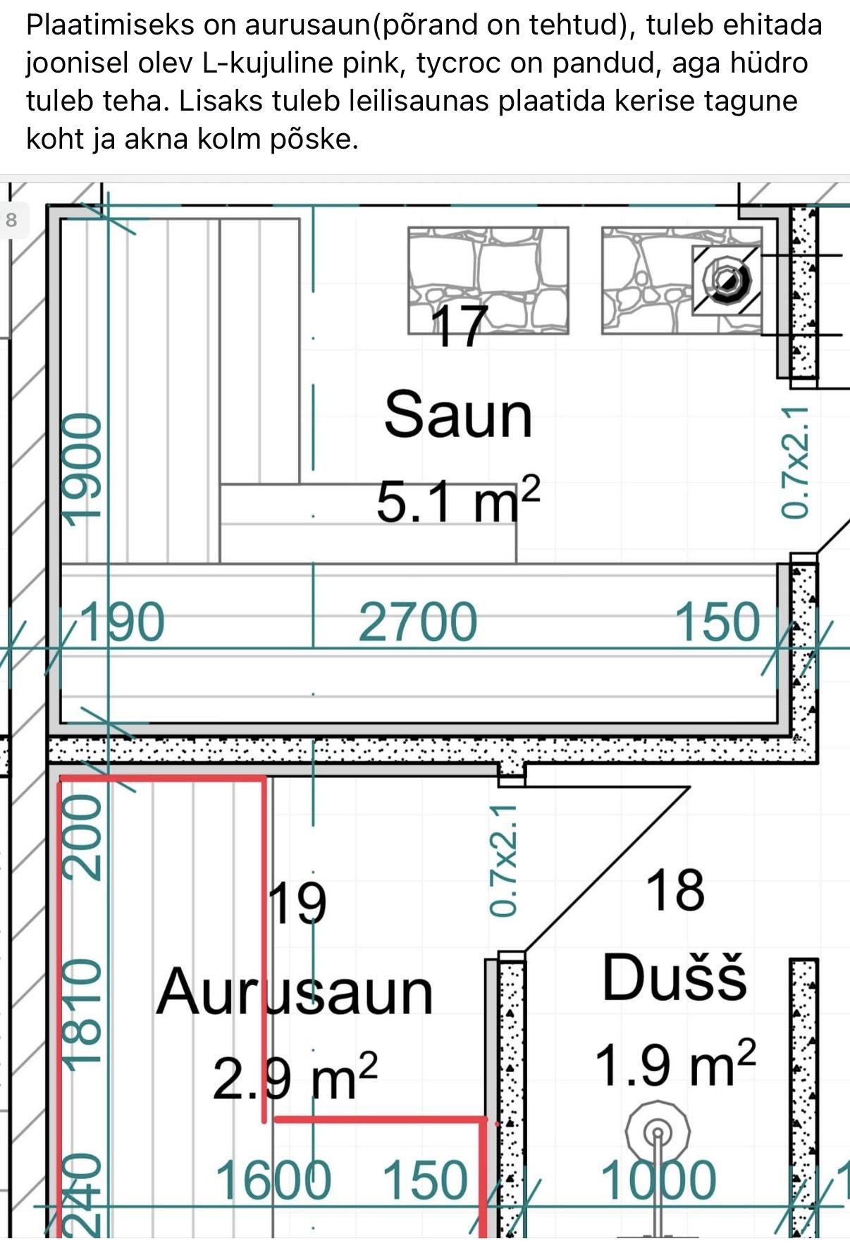 Aurusauna tuleb ehitada joonisele märgitud pink ja aurusauna lagi, seinad ja pink plaatida 45kraadiga. Leiliruumis tuleb plaatida kerisetagune sein ja akna 3põske.
