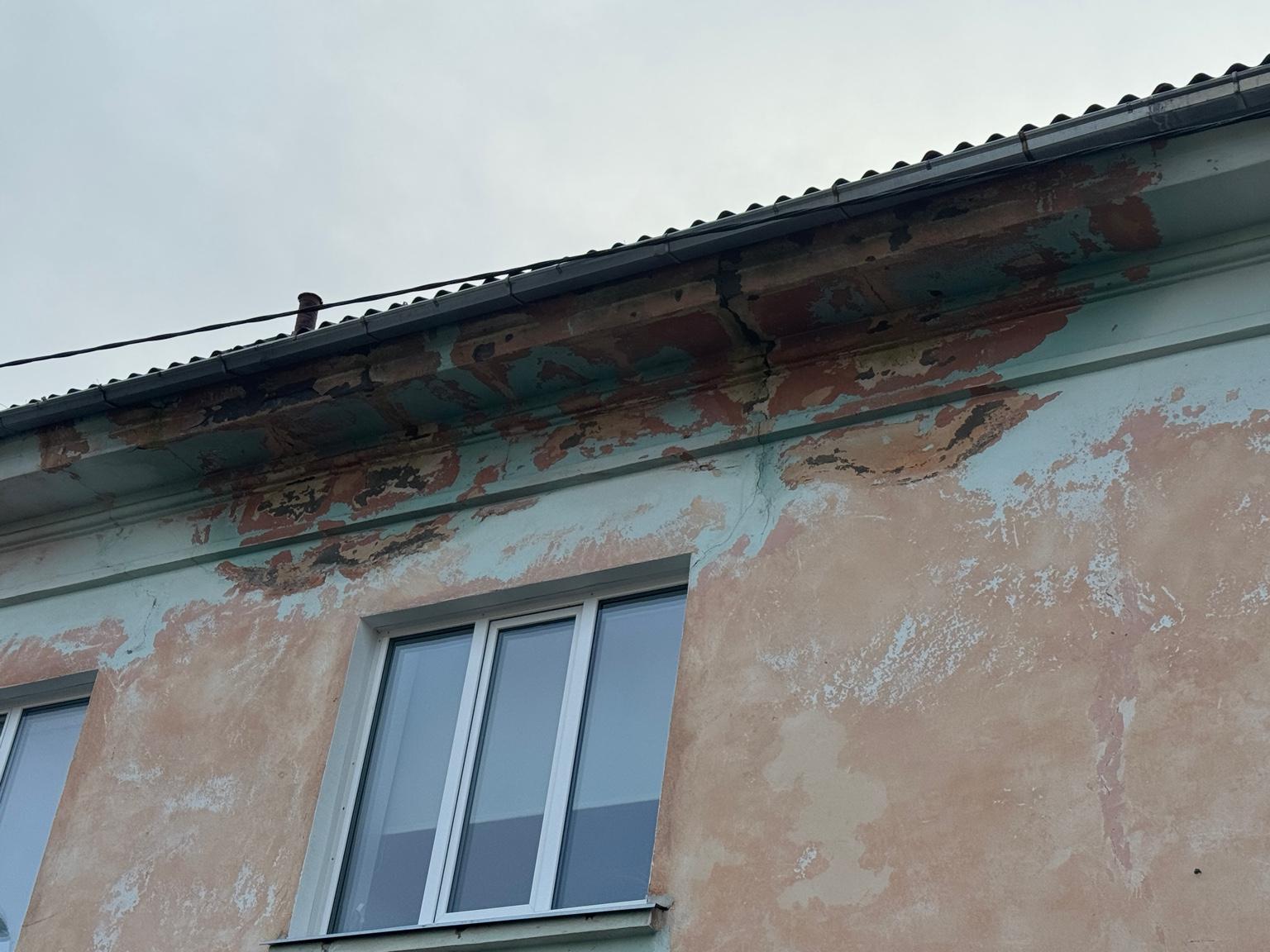 Kahekorruselise korterelamu katuse ääres olevad plekkrennid ja räästaalune konstruktsioon on tugevalt kahjustunud. Vesi on pikalt valgunud mööda seina alla, mis on põhjustanud: