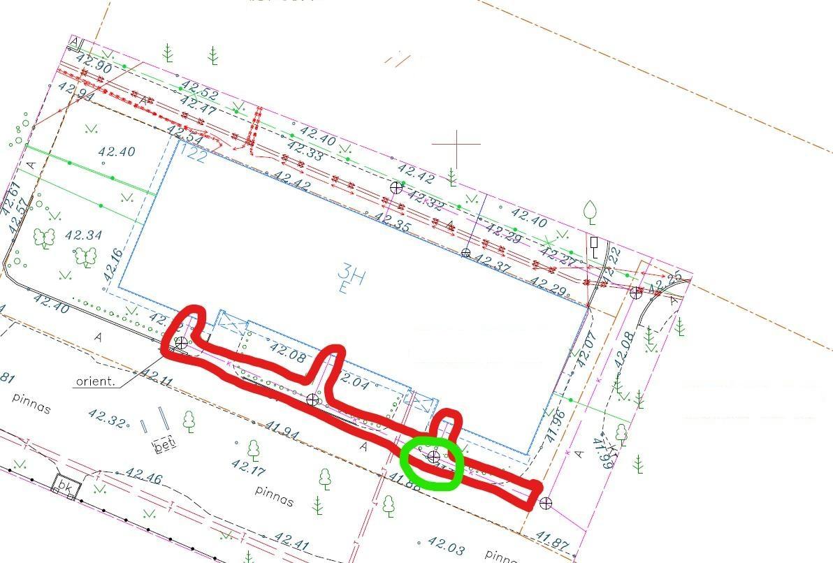 Rekonstrueerida tuleks punasega tähistatud alas asuv kanalisatsioonitrass. Trassi kogupikkus on 32 m, millele lisandub veel 3 kaevu ja 3 majja minevat kanalisatsioonitoru 2,5+4+3 meetrit. Kogu trass asub kinnistul sees. Ristuda tuleb vaid soojatrassiga, teisi kommunikatsioon seal pool maja ei esine. Ligipääs on olemas ja ruumi tööde teostamiseks piisavalt. Asfaltkatendi taastamisega arvestama ei pea.