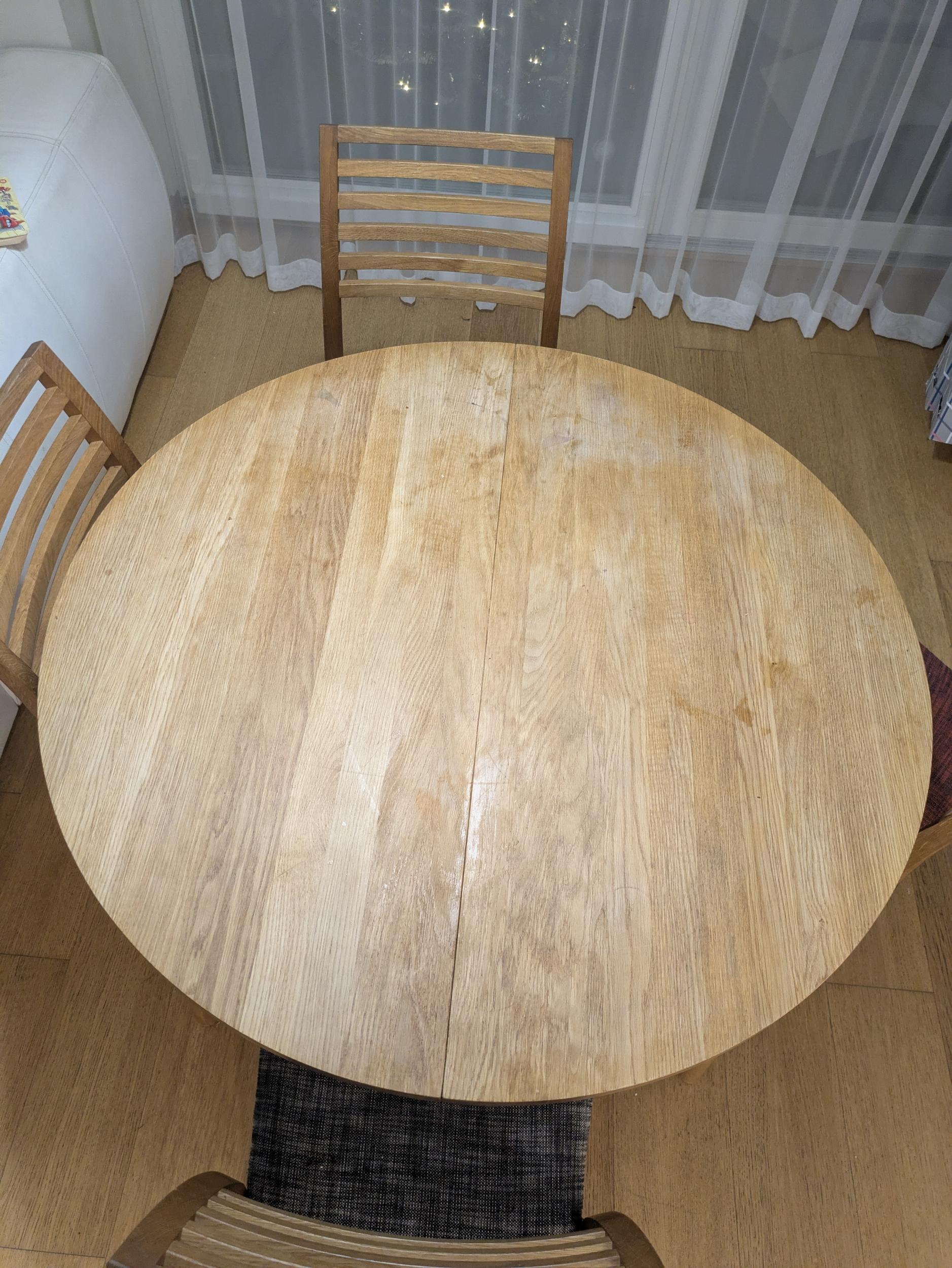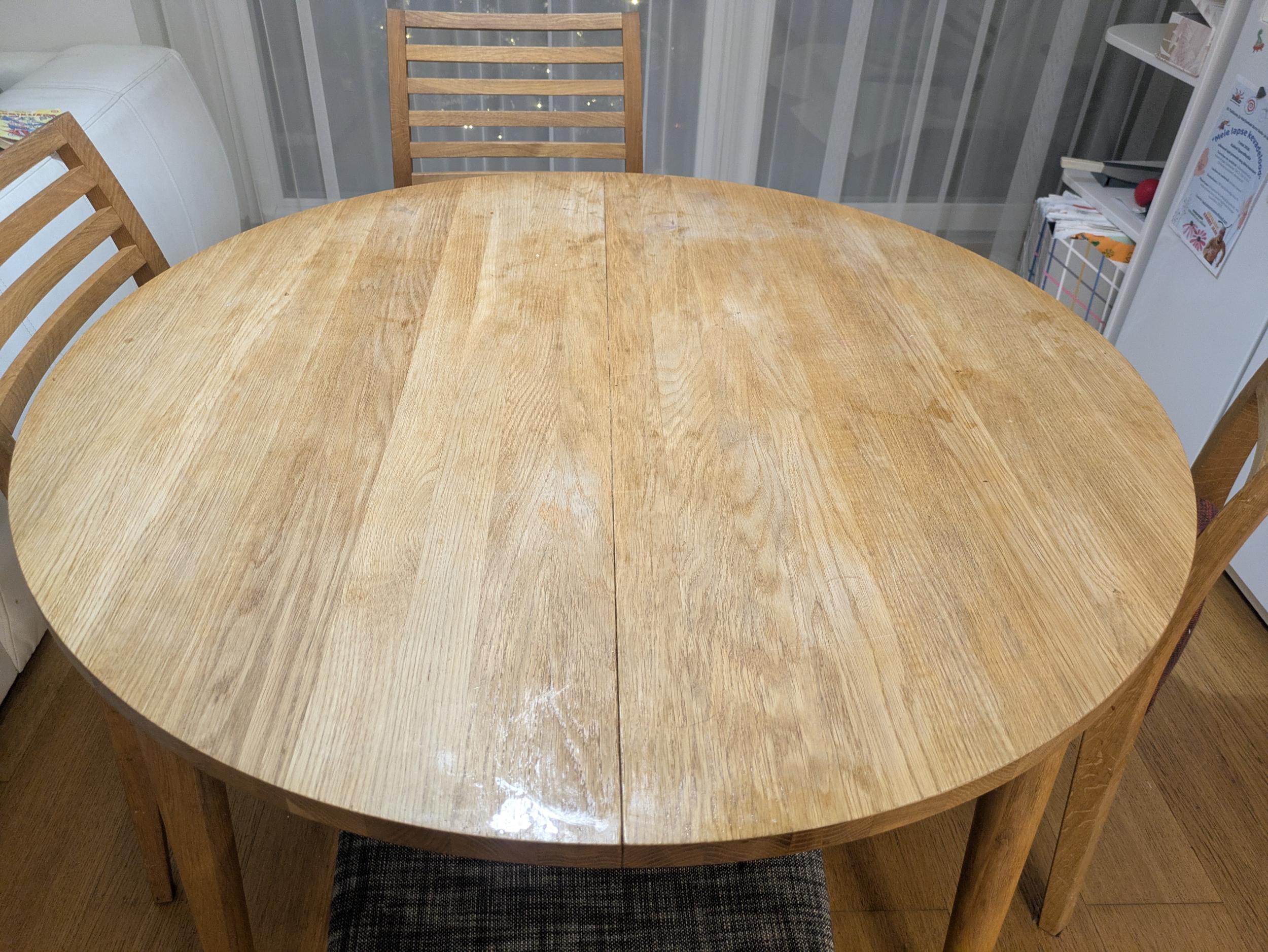 Mul on 110 cm diameetriga pooleks käiv ümargune tammest söögilaud, mida on OSMO vahaga vahatatud. Aja jooksul on laigud ja plekid sisse kulunud. Oleks vaja laud üle lihvida ja vahatada.