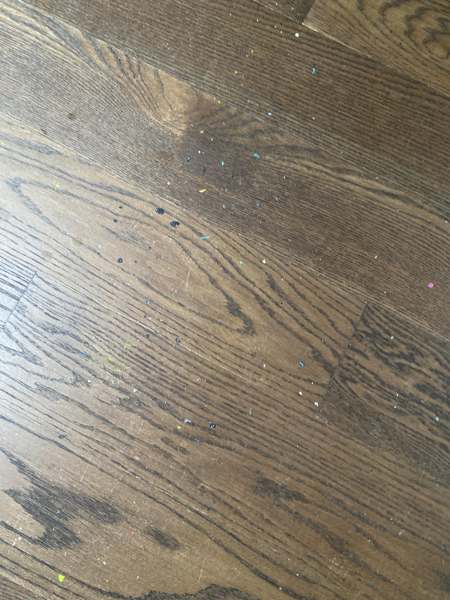 Tammeparketil on värvipritsmed (akrüülvärv), vajab lihvimist ja õlitamist (OSMO õli).