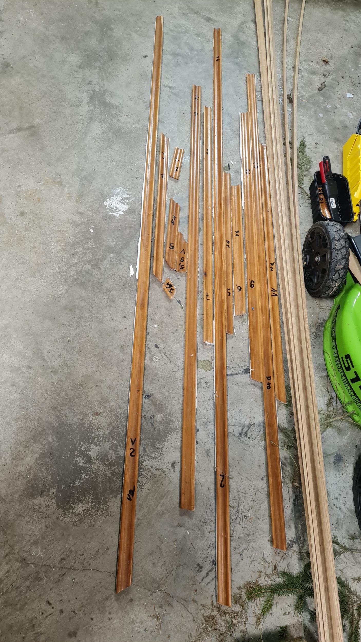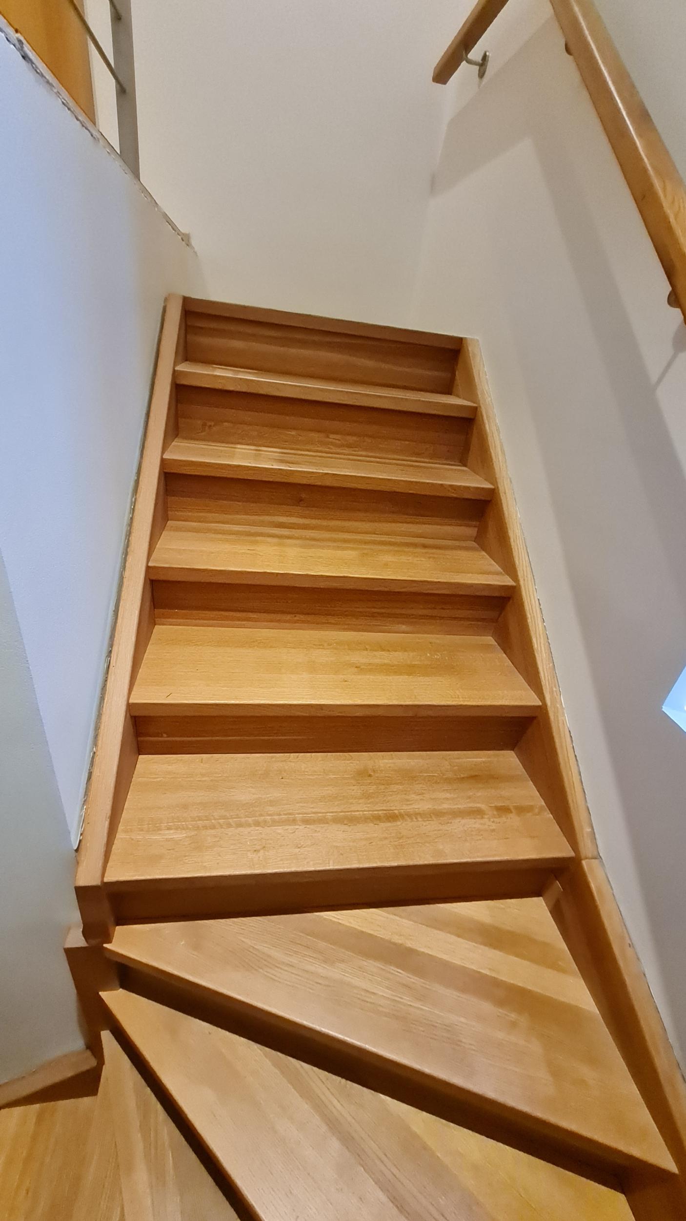 Vaja on paigaldada trepile piirdeliistud (mööda seinaääri). Trepp on pöördega, mistõttu liistusid tuleb lõigata väga erinevate nurkade all ning kohati ka käsitsi vesta, et väikesed detailid ilusti kokku sobiksid. Vanad piirdeliistud, mis sai remondi tõttu eemaldatud, on samuti alles (ühel fotol näha). Need olid männist sisenurgaliistud, 22x25 mm. Uued liistud on tammest sisenurgaliistud, 22x22 mm.