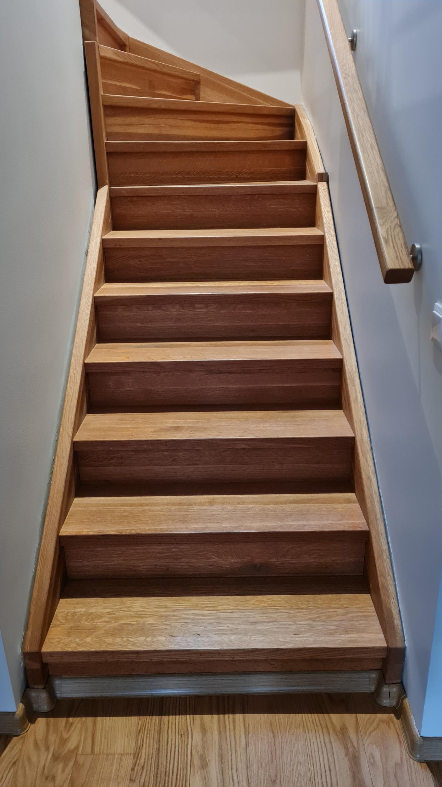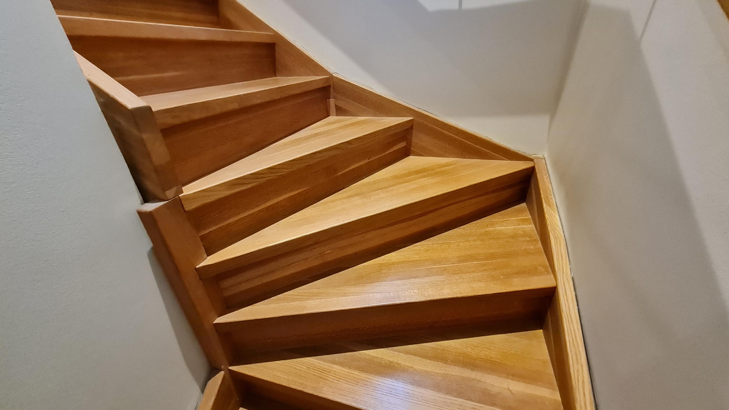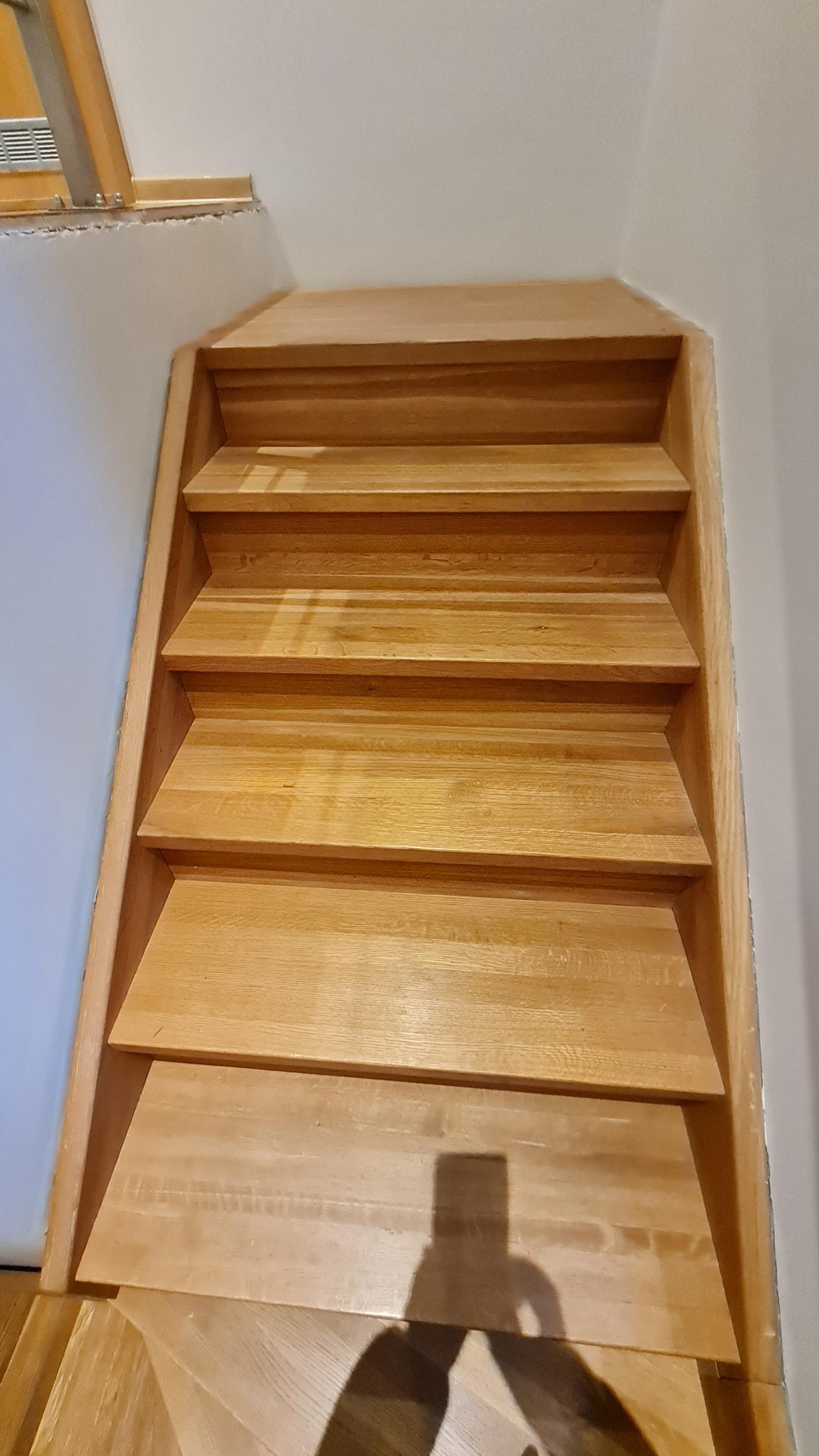 Vaja on paigaldada trepile piirdeliistud (mööda seinaääri). Trepp on pöördega, mistõttu liistusid tuleb lõigata väga erinevate nurkade all ning kohati ka käsitsi vesta, et väikesed detailid ilusti kokku sobiksid. Vanad piirdeliistud, mis sai remondi tõttu eemaldatud, on samuti alles (ühel fotol näha). Need olid männist sisenurgaliistud, 22x25 mm. Uued liistud on tammest sisenurgaliistud, 22x22 mm.