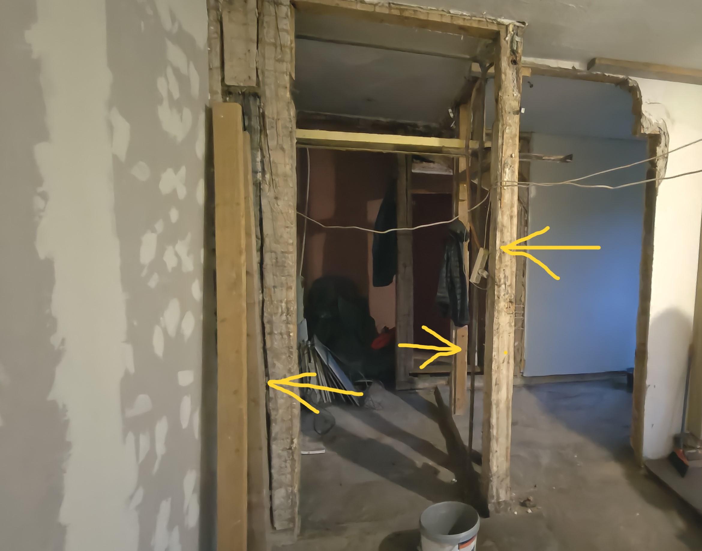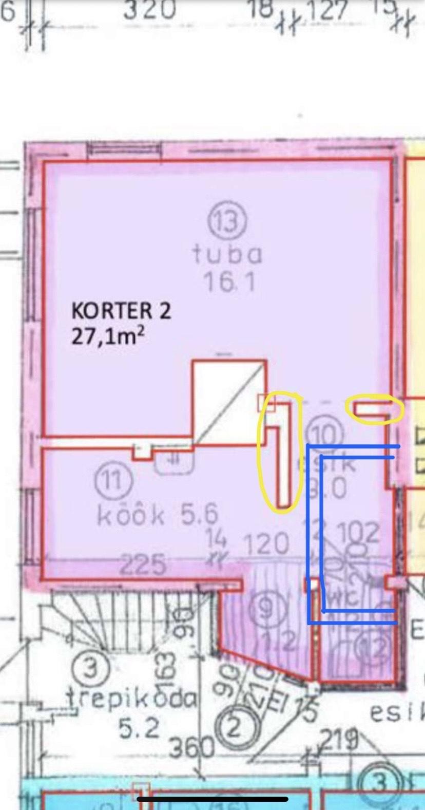 Soovin tellida korteri kandva seina ümbertegemise projekti. Vajan spetsialisti, kes koostaks ehitusprojekti ja kogu vajaliku dokumentatsiooni. Lisan korteri plaani, kus sinisega olen märkinud umbes kuhu uut seina tahaks ja kollasega vanad seinad millest lahti tahaks saada. Ahi on välja lammutatud. Majal on kaks korrust ja teiselt korrusel on ahi samas kohas kus minu korteri plaanil.
