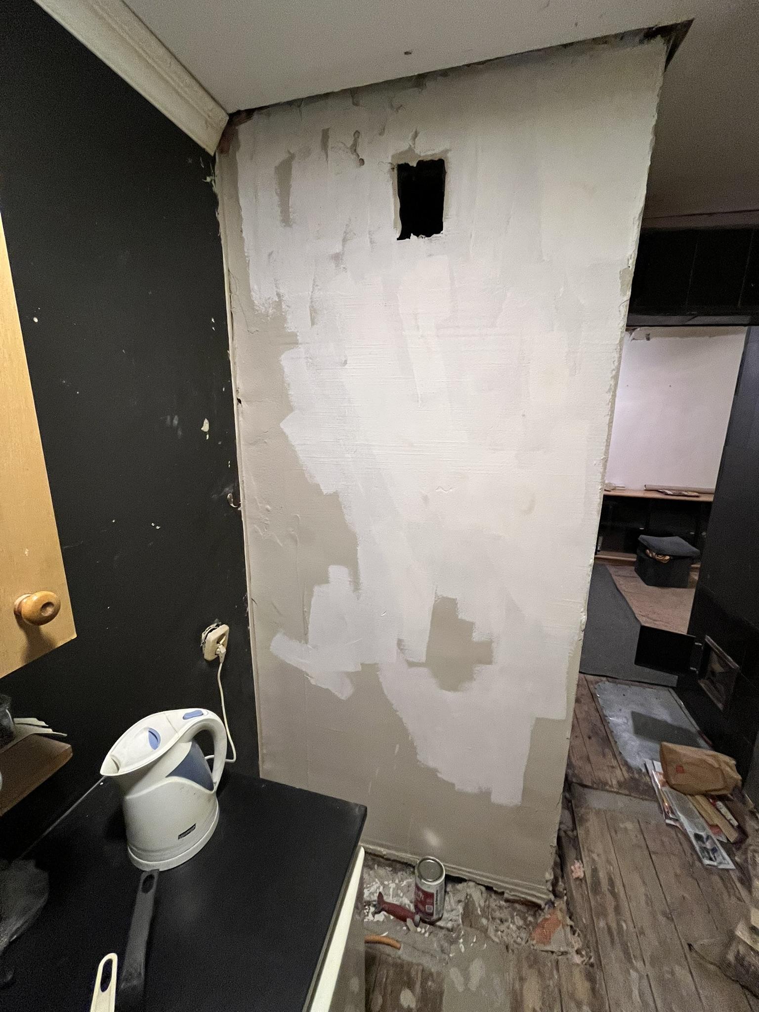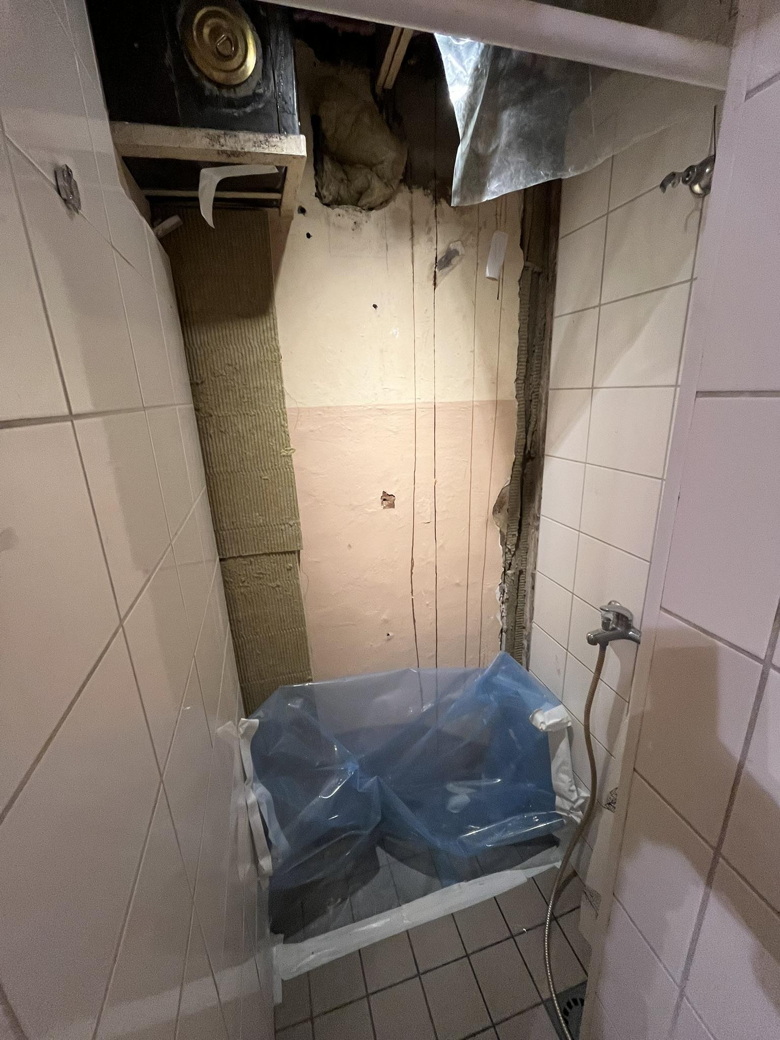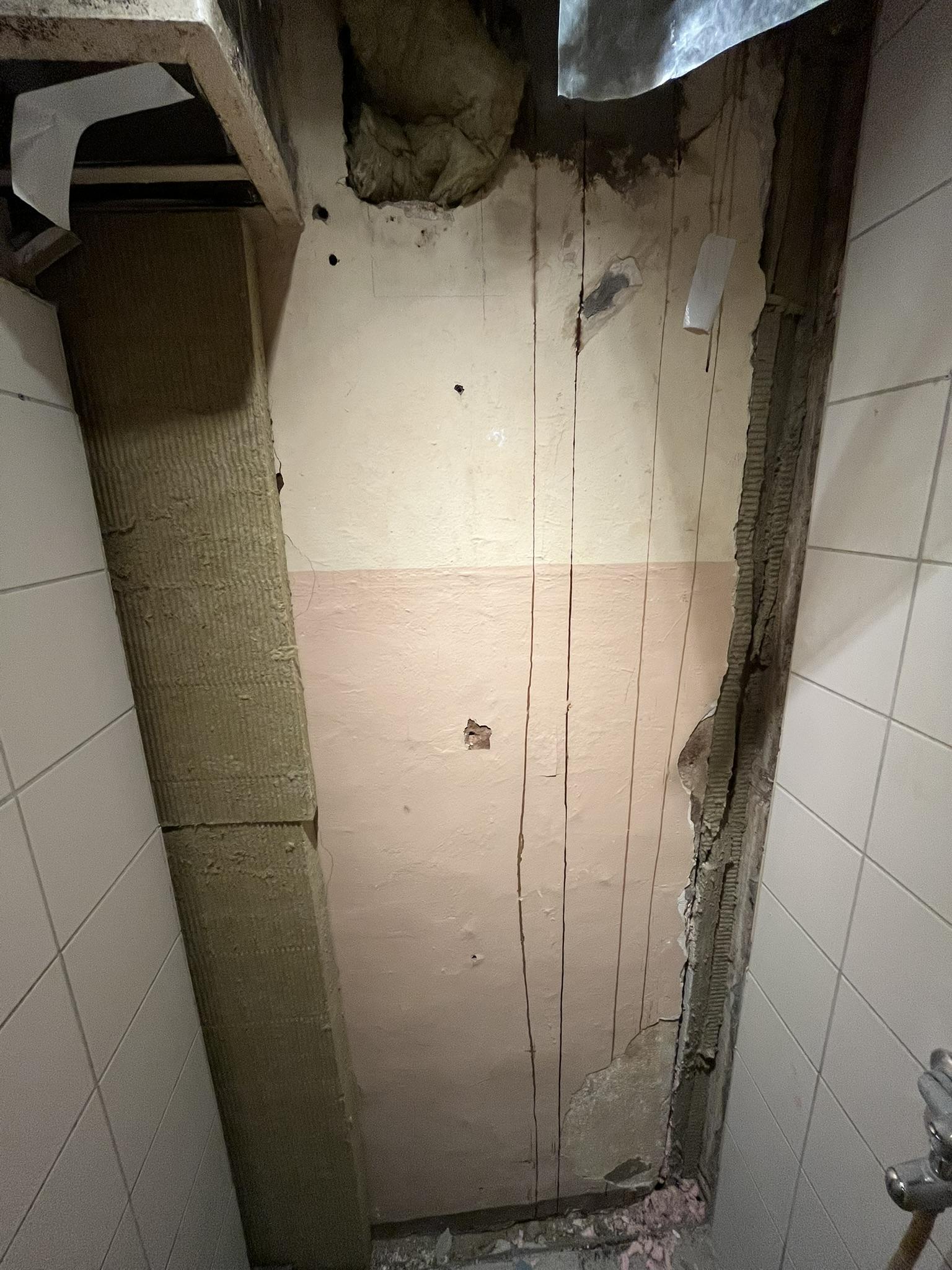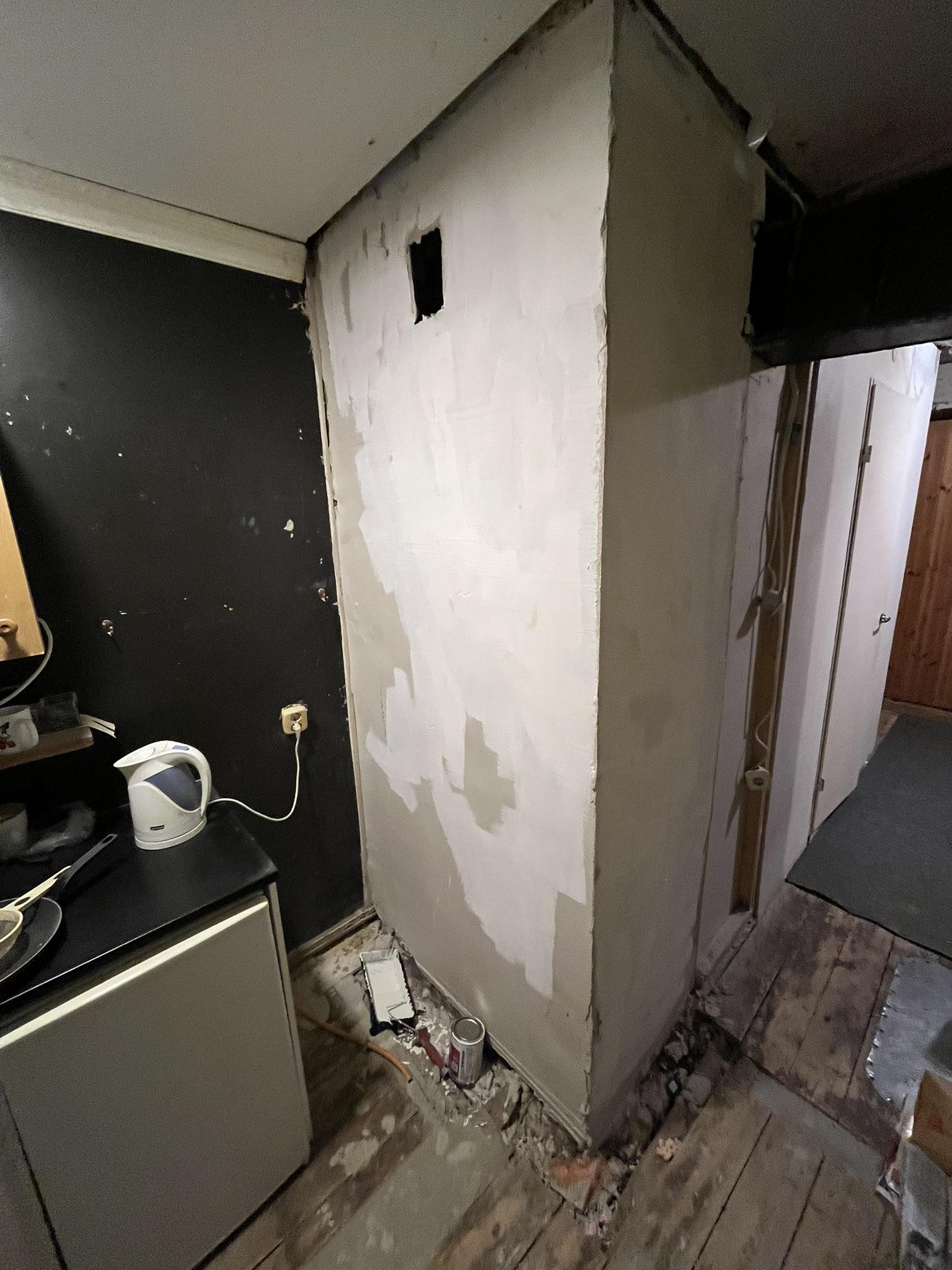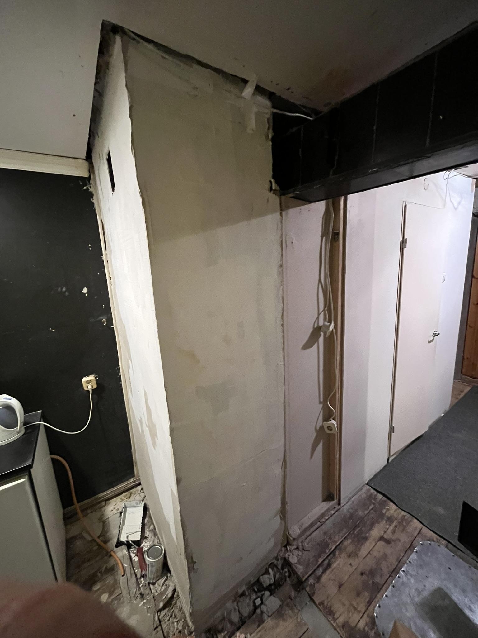 Korstna jalg oli kaetud puitkarkassiga ning tuleohutusspetsialist käskis selle lammutada. Korstna jalg on köögi poolt kaetud takistusega ja katsetuseks krohvitud (ning värvitud). Ilmselt tuleb teha veel mitu kihti pigi läbi imbumise takistust ja krohvi? Plaani ootame pakkujalt! Vannitoa poolelt pole tehtud midagi. Uut karkassi ei ole ilmselt mõtet ehitada, kuid nüüd tuleks ilmselt: