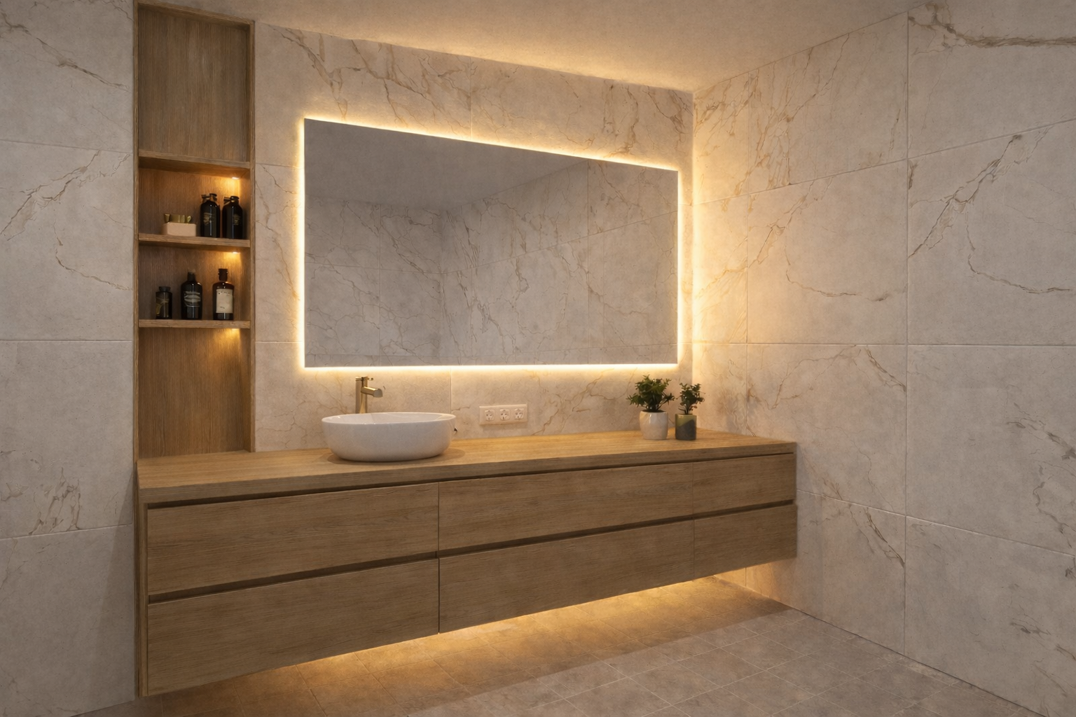 Pakkumise kirjeldus: Täispuit (tamm) mööbel. Kvaliteetsed mööblifurnituurid ja led tuled. Hinna sees peegel. Enne töö teostamist lepime kokku disaini ja koostame joonise. |