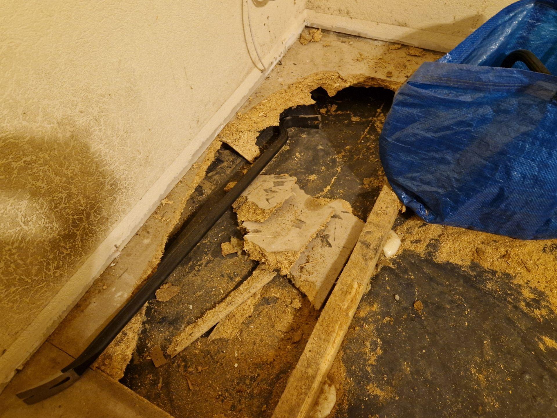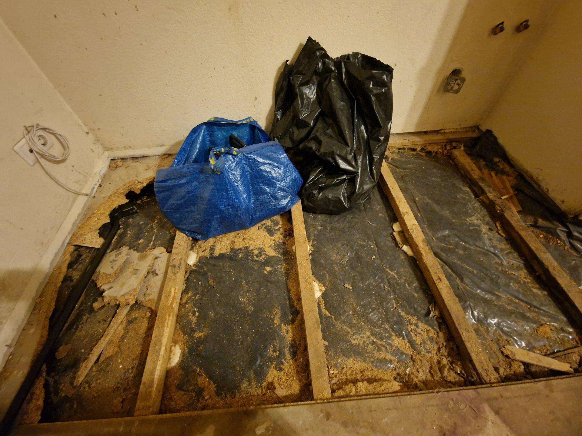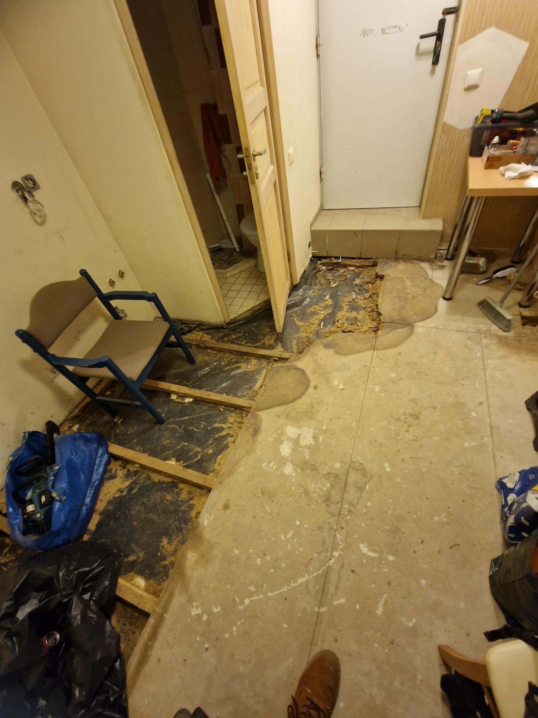 Töö sisuks on vana puitpõranda lammutamine (40% juba lammutatud), põrandakütte paigaldus ja põrandavalamise betoonitööde ettevalmistust - armatuuri paigaldus, kile, EPS peno, paisušvamm jms ning lõpuks betooni valamne. Puitpõranda kõrgus 9mm, kile all tundub olema betoon.