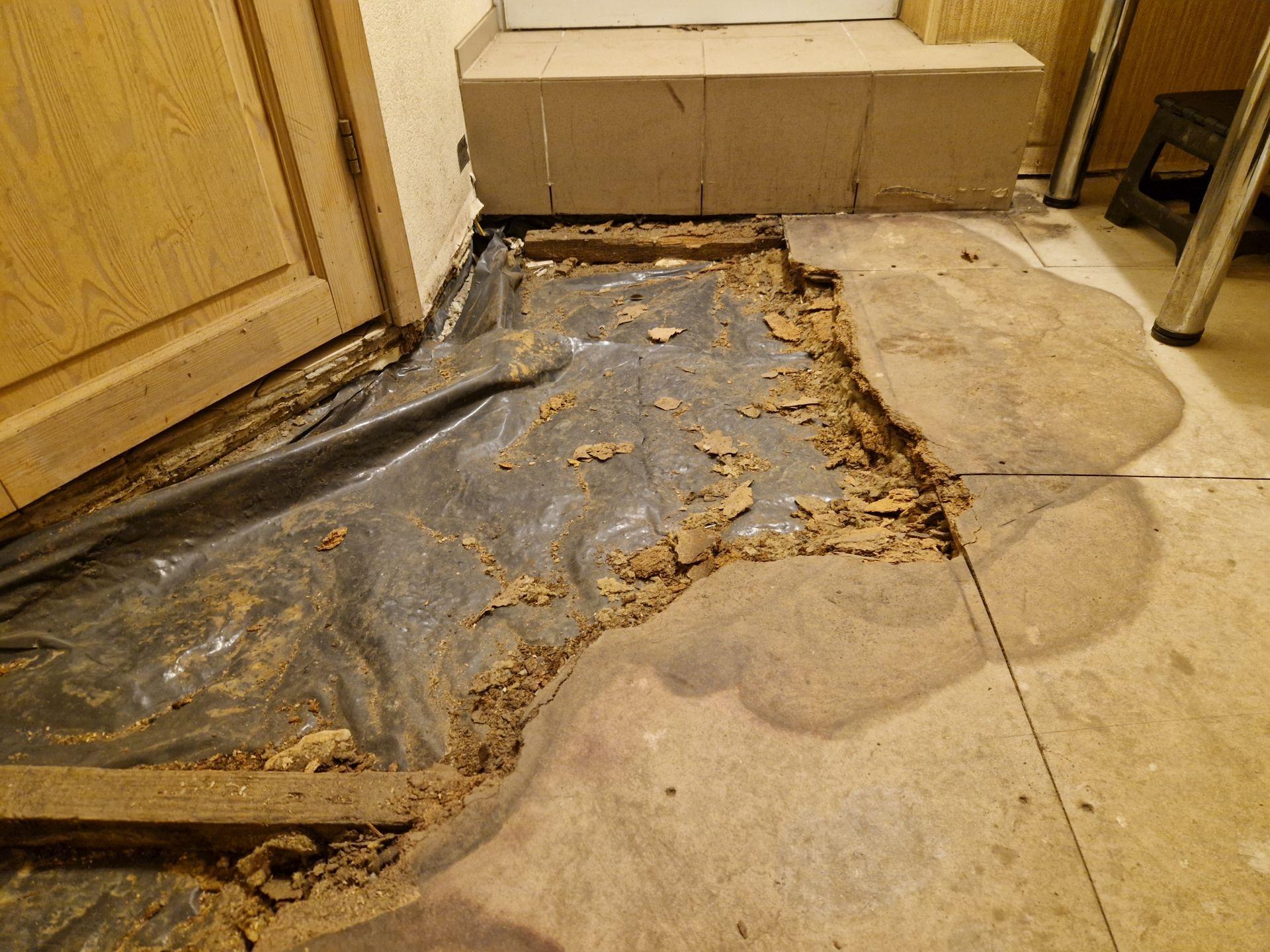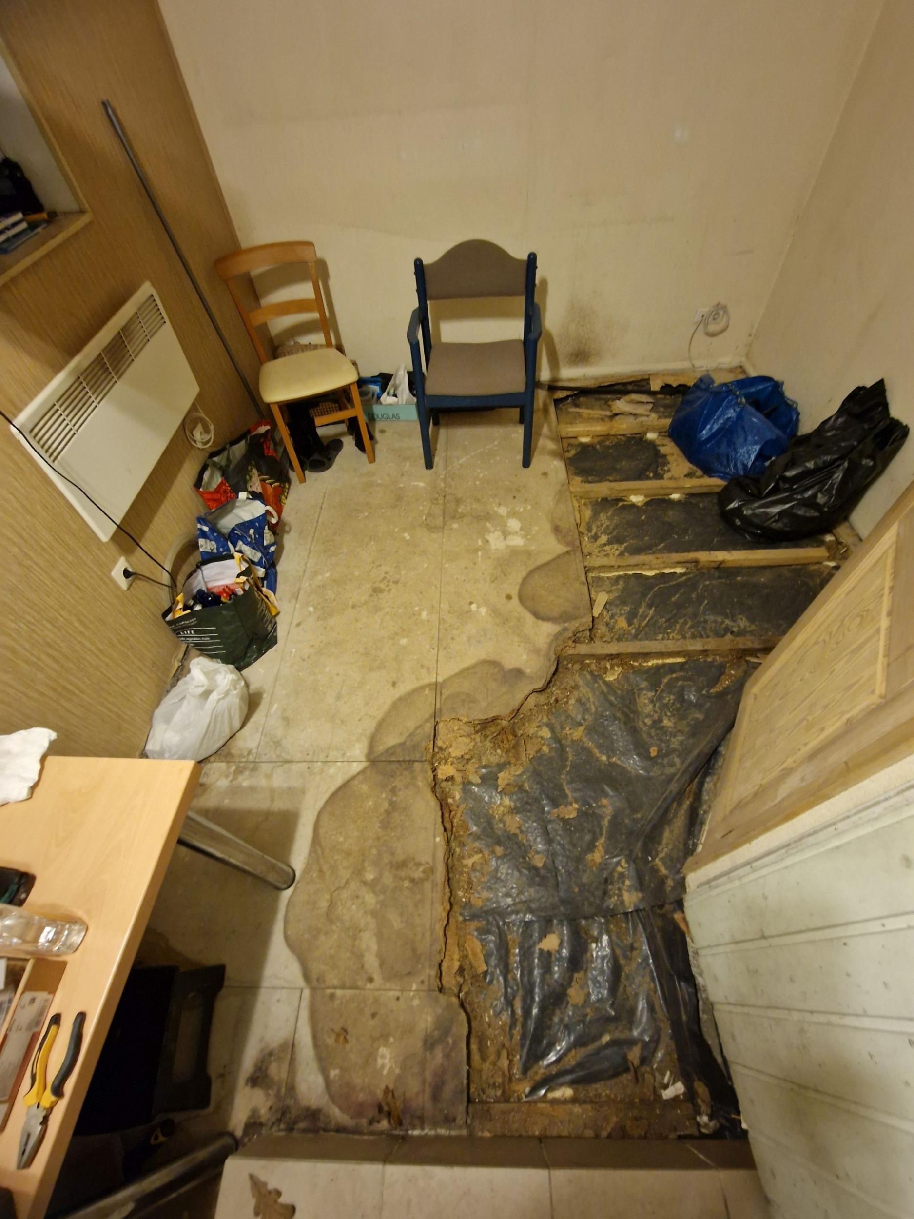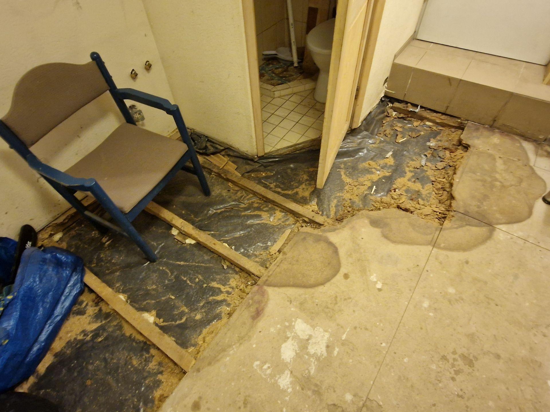 Töö sisuks on vana puitpõranda lammutamine (40% juba lammutatud), põrandakütte paigaldus ja põrandavalamise betoonitööde ettevalmistust - armatuuri paigaldus, kile, EPS peno, paisušvamm jms ning lõpuks betooni valamne. Puitpõranda kõrgus 9mm, kile all tundub olema betoon.