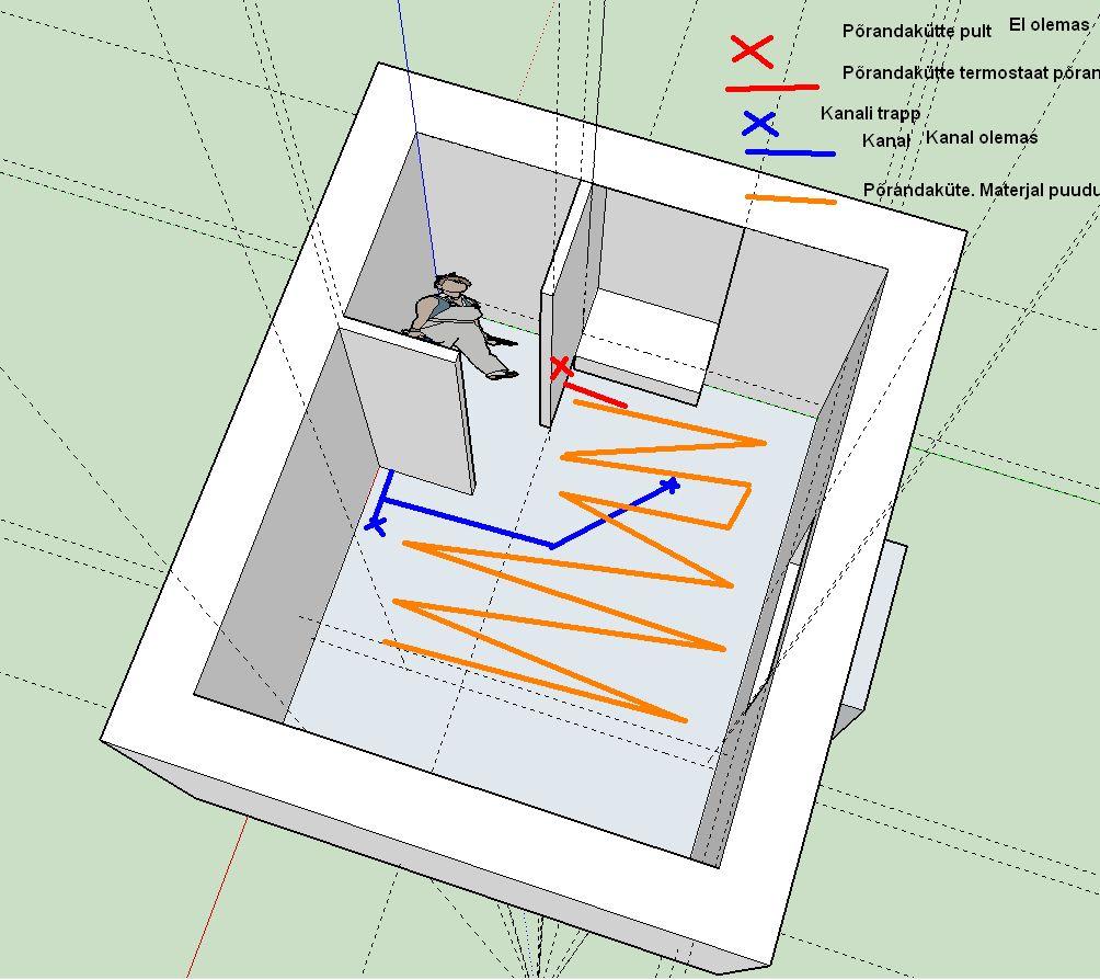 Põrandasse betooni sisse jäävad siis põrandaküte, kanalitoru äravooluks ja mõned elektrikaablid. Põranda keskele jääb äravoolutrapp. Pakumises arvestada, et kanali torud ja el kaablid on olemas ja paigas.