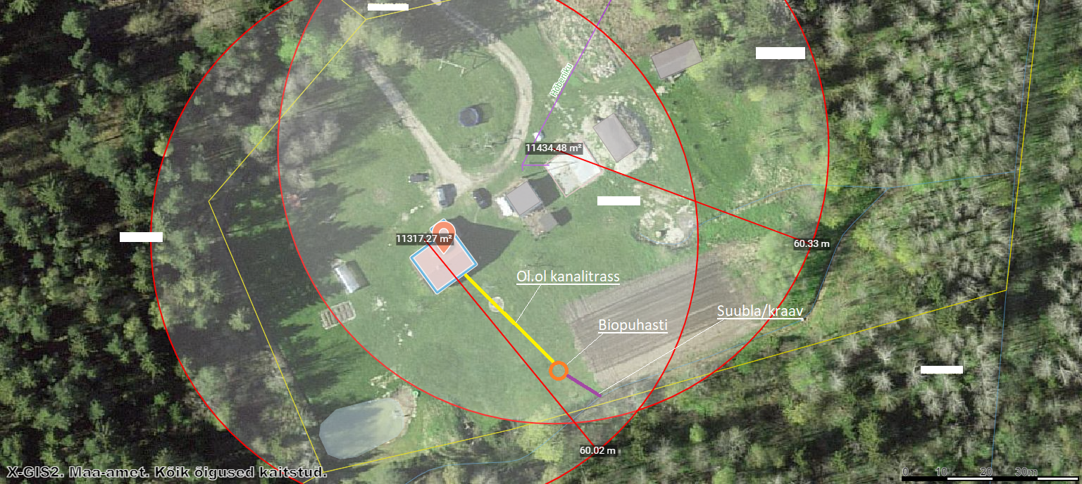 1. Lähim salvkaev on otse maja juures. Pildil olevate nö kaitsetsoonid on võetud kahe kaevu tsentrist 60m.