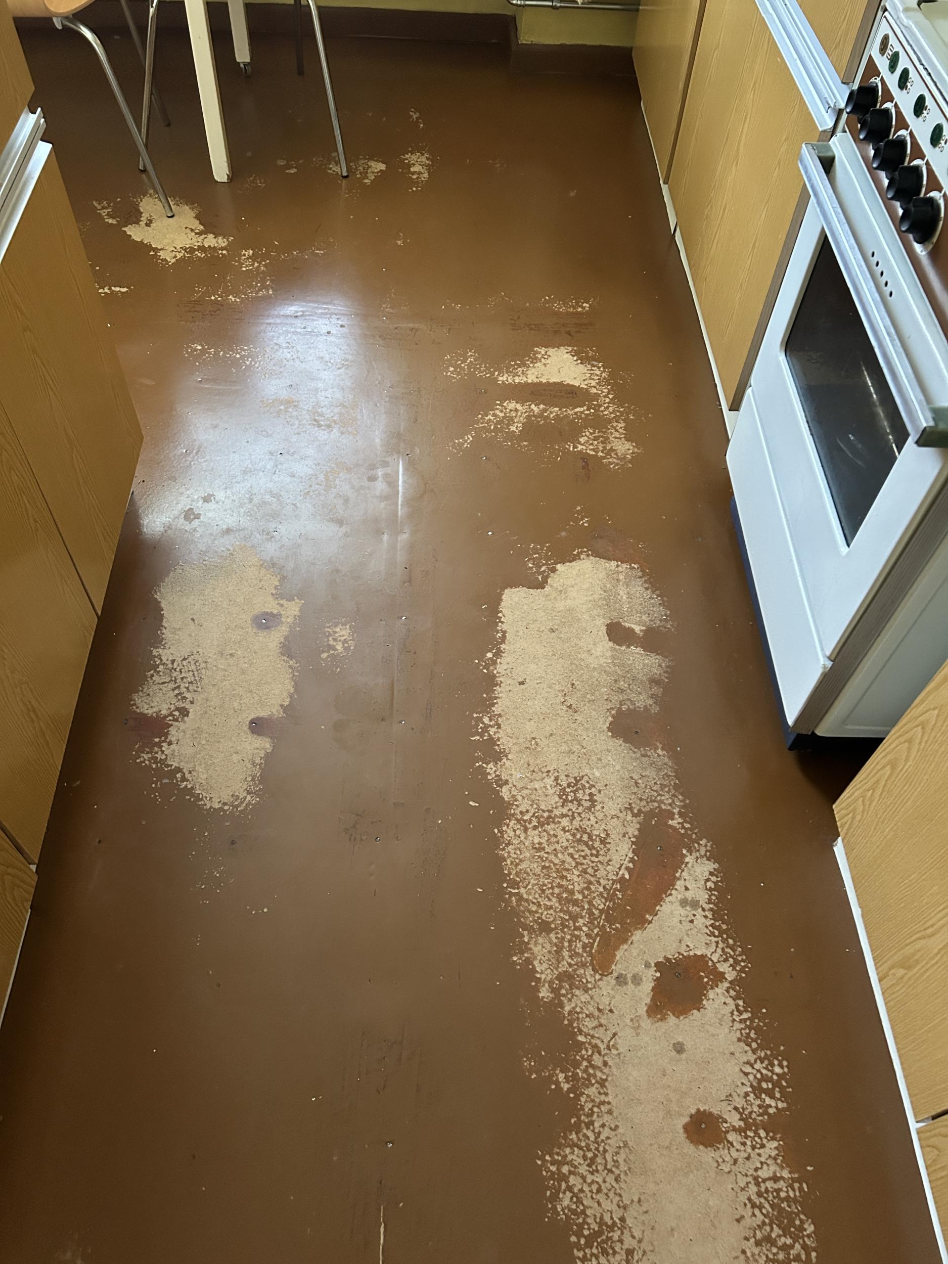 pinnal veekahjustus. Valamu all veeventiilid ja äravool lahti ühendatud juba san tehniku poolt. Uueks põrandaks tuleb lineolum.