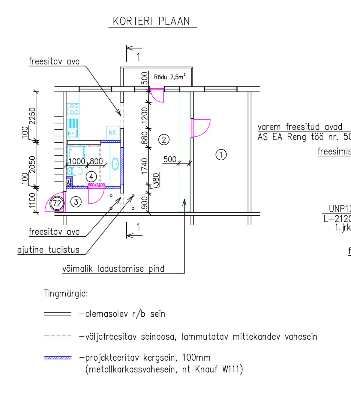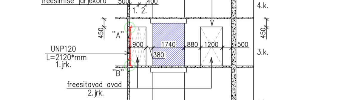 Enne esiku ja elutoa vahele ava freesimist toestada laed ajutise tugistusega. Teraselemendid puhastada roostest ja kruntida. Avade lõikamisel tuleb kasutada vibratsioonivaba tehnoloogiat (teemantsaagimine). Väljafreesitavad seinaosad freesida mitte suuremate kui ~50x50cm tükkidena. Tükke utiliseerida ei ole vaja.