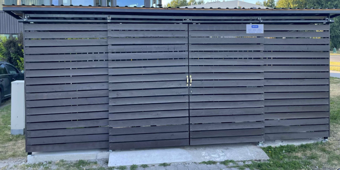 Soovin tellida prügimaja/panipaiga orienteeruva suurusega 19,9m2. Mõõdud nt 6x3,3m vms. Prügimaja peab olema nagu pildil näha, hõreda laudisega. Orienteeruvalt 1/3 jääb prügikastidele, 2/3 panipaigaks (kerge seinake võiks olla nende kahe sektsiooni vahel). Prügiosakond jääb avatud seinaga, vt joonist, kollane ala, panipaiga osa uksega, joonisel roosa ala. Maja peab olema kaldkatusega.