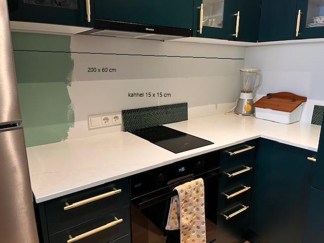 Kahhel olemas ja näha fotodel, 15 x 15 cm plaat, plaatimissegu ei oska osta, vuugitäite ostan samuti ise.