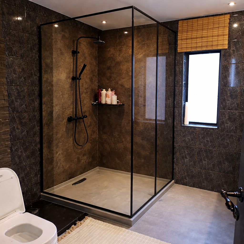 Duššinurk kahest küljest suitsuse/pronks värvi tumendatud klaasiga. Ukse vajadust ei ole, jääb avatud ukse avaga. Nurga suurus ~90 x 80cm.