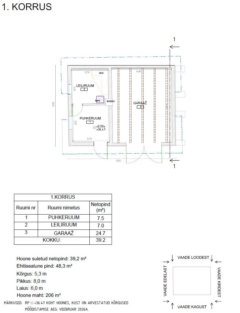 Vaja sauna-garaaži rekonstrueerimisprojekti eelprojekti staadiumis ehitusteatise jaoks vajaliku dokumentatsiooniga. Hoone on EHR'is (EHR kood 120734508). Olemas on geoalus, hoone mõõdistus ja joonised praegusest olukorrast. Fotod praegusest ja soovitud tulemusest. Projekt peab sisaldama arhitektuurset ja ehituslikku osa ning vajalikke eriosasid. Palun märkida pakkumuses töö maht, tähtaeg ja kas hind sisaldab ehitusteatise esitamist.