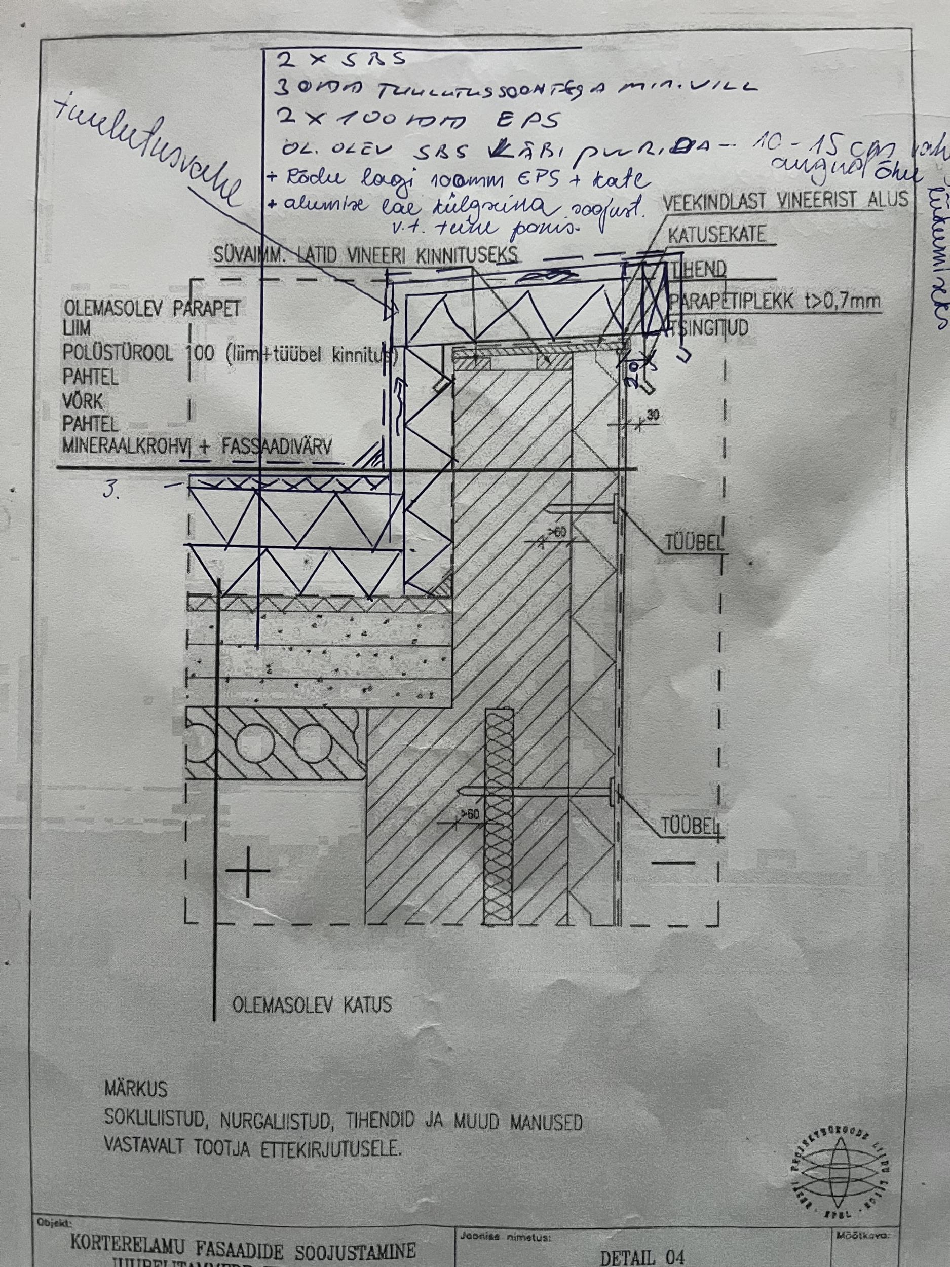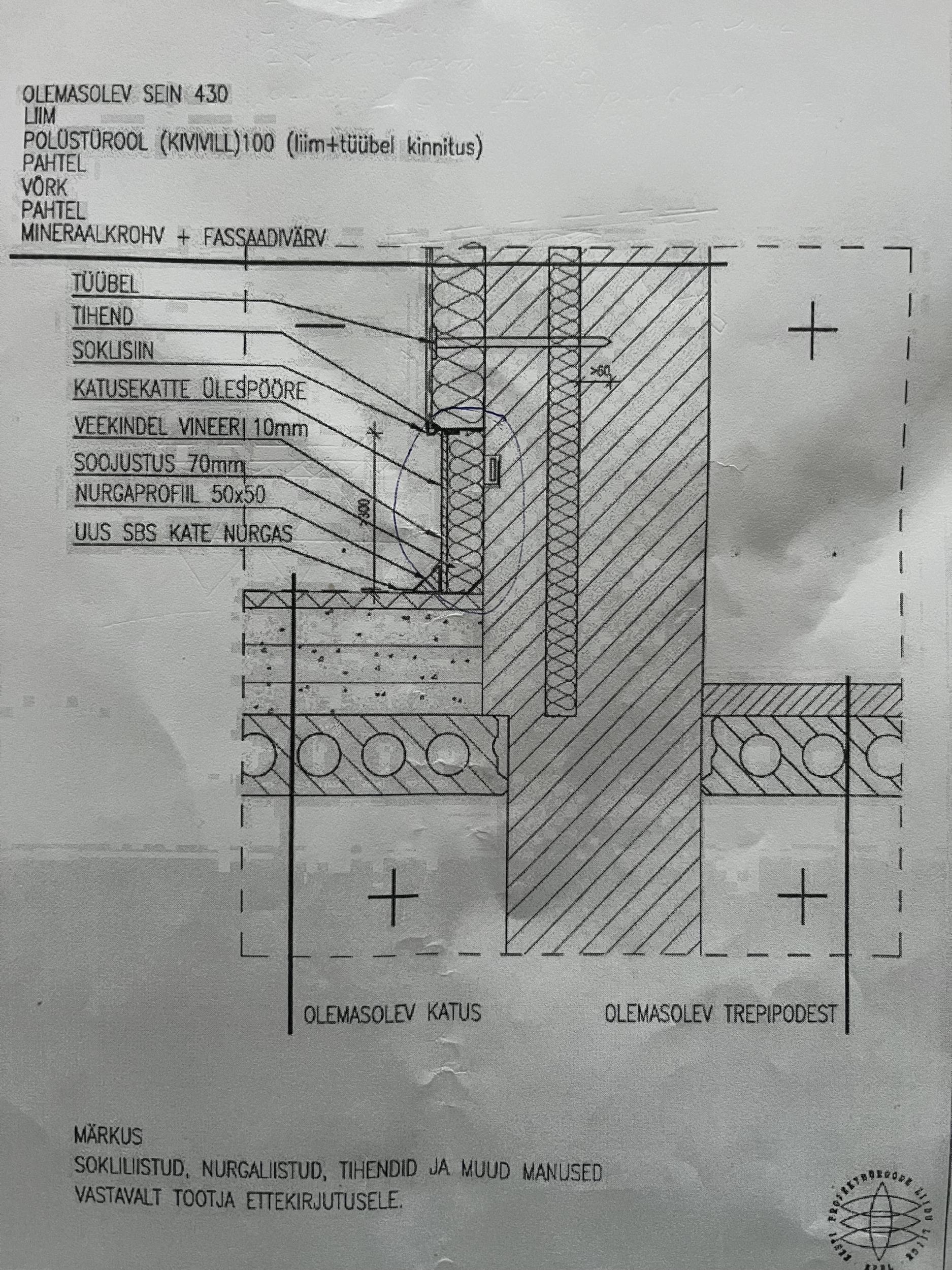 Praegune katuse materjal on SBS. Teostatavate tööde tegemisel on vajalik olemasolev SBS läbi puurida õhu liikumise tekitamiseks. Seejärel paigaldada 2 x 100 EPS plaat ning 30 mm tuulutussoontega mineraalvill, mis katta 2 x SBS-ga. Info ka lisatud joonisel.