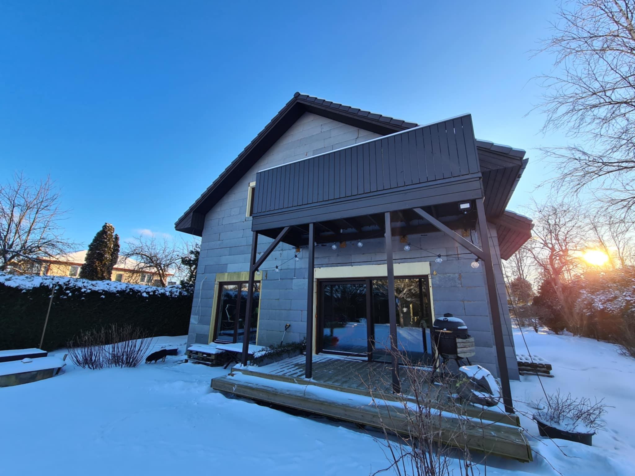 Vaja on krohvida eramaja. Piltidel on osa fassaadi laudis, aga projekti muudatusega tuleb kõik krohvi alla. Maja ehitatud termoplokist. Pindala 280 ruutmeetrit.