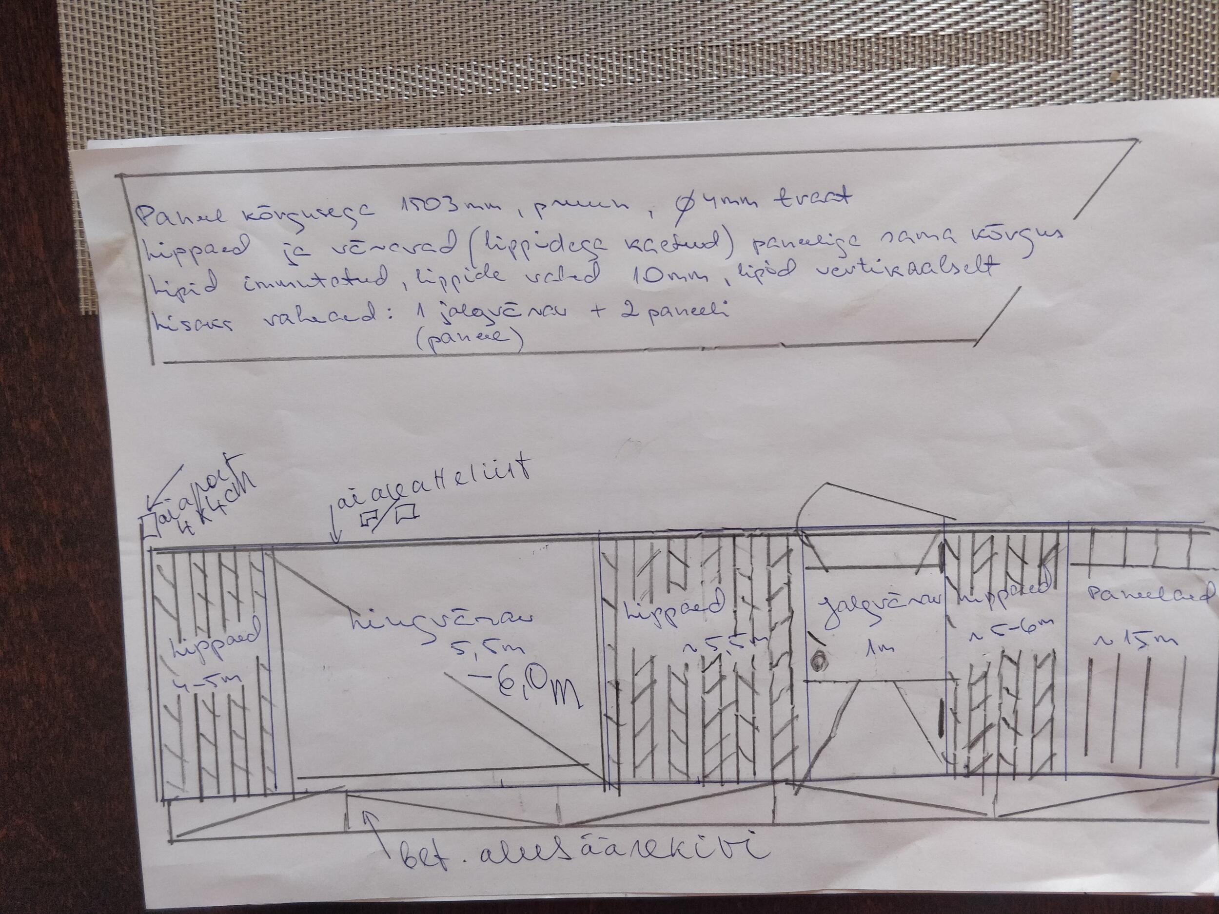 1,6 m kõrge 32 jm.paneelaeda;5,5 jm liugvärav+jalgvärav 1,2 jm.Liugväraval puitlipid püstisuunas.Alla osapikkuses 17 jm.betoonist aluskivi.