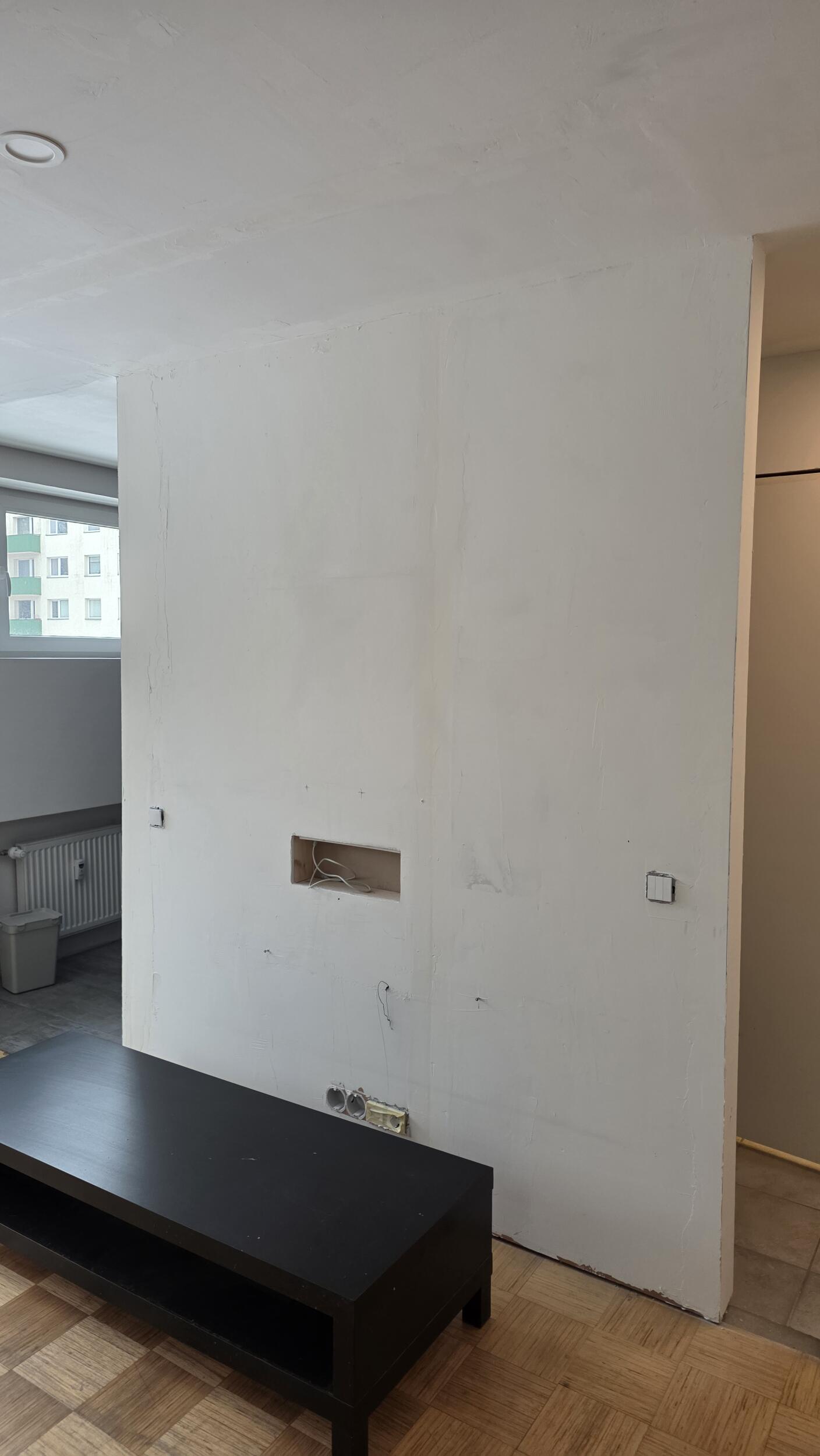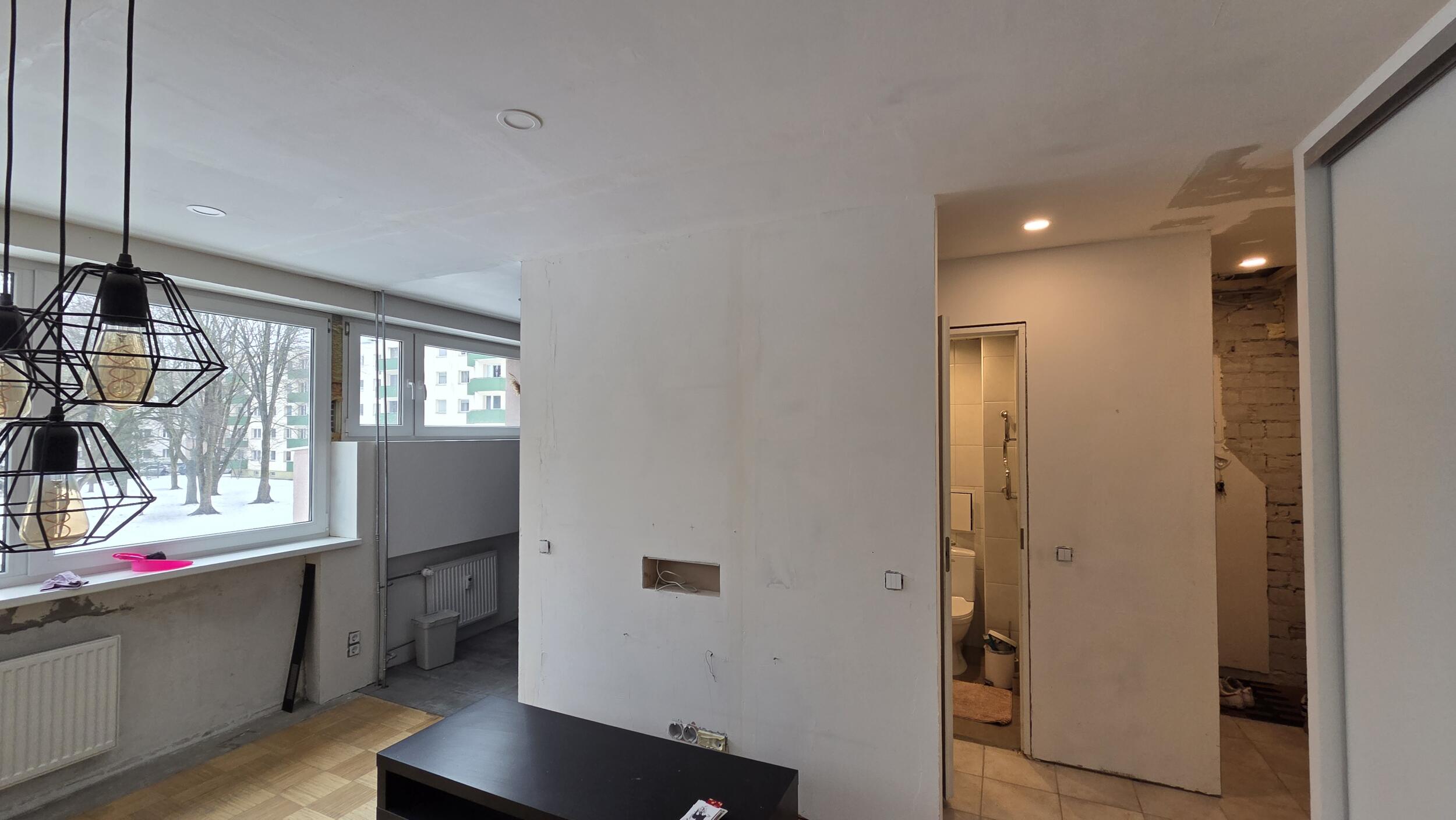 Esikus on enamasti kips pandud. Pahteldatud ei ole veel. 1 sein vajab kas krohvimist või kips ja pahtlit.