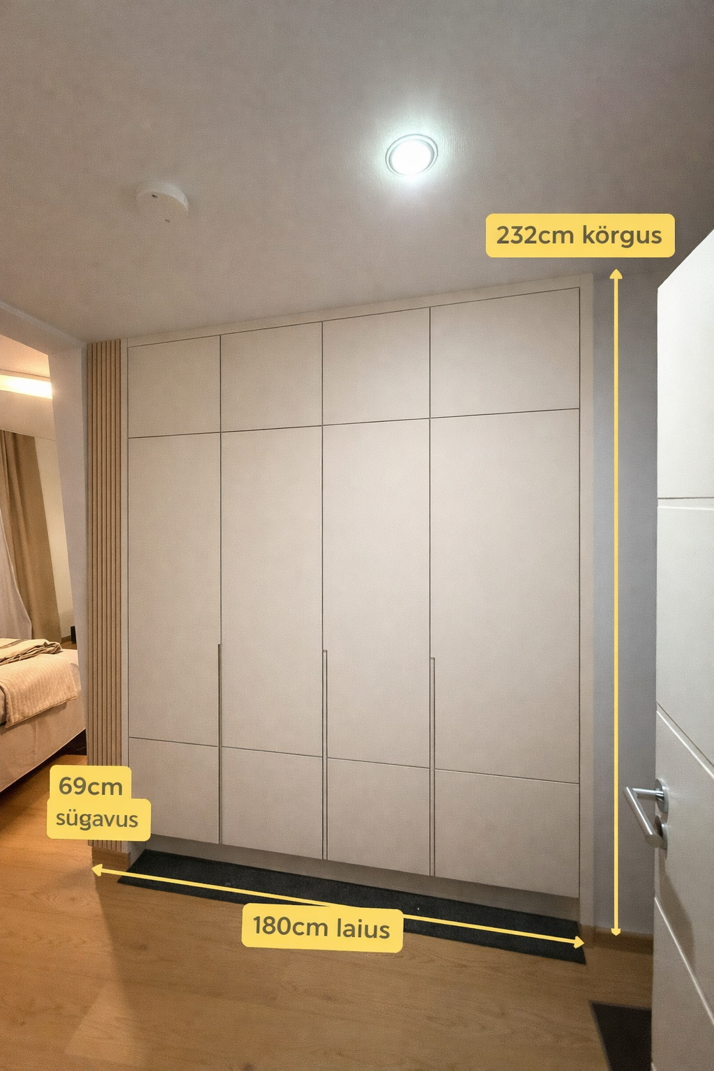Pakkumise kirjeldus: Liugustega kapp. Vasakul pool riiulid, paremal pool riputusala. Eest kaks liugust |