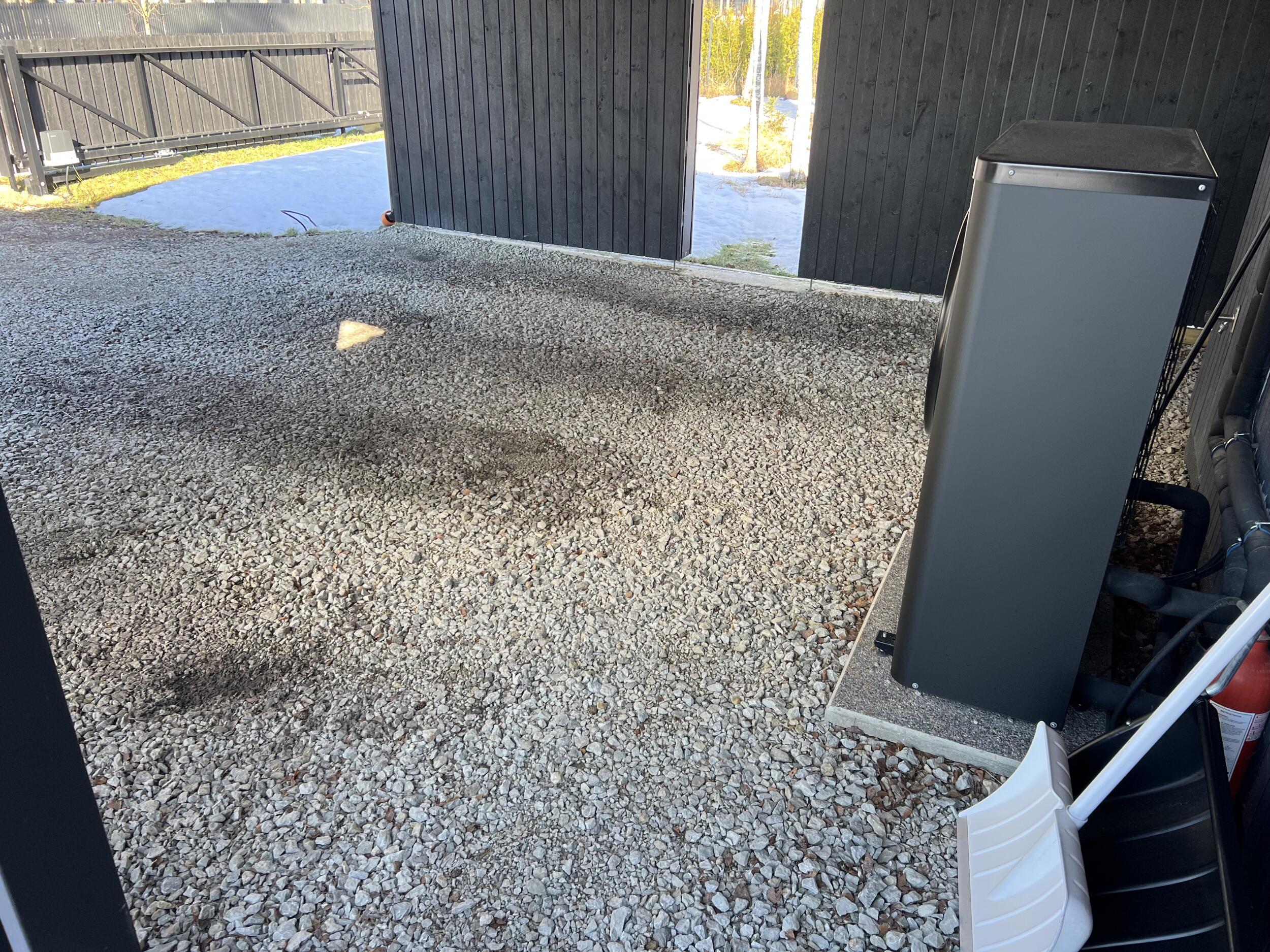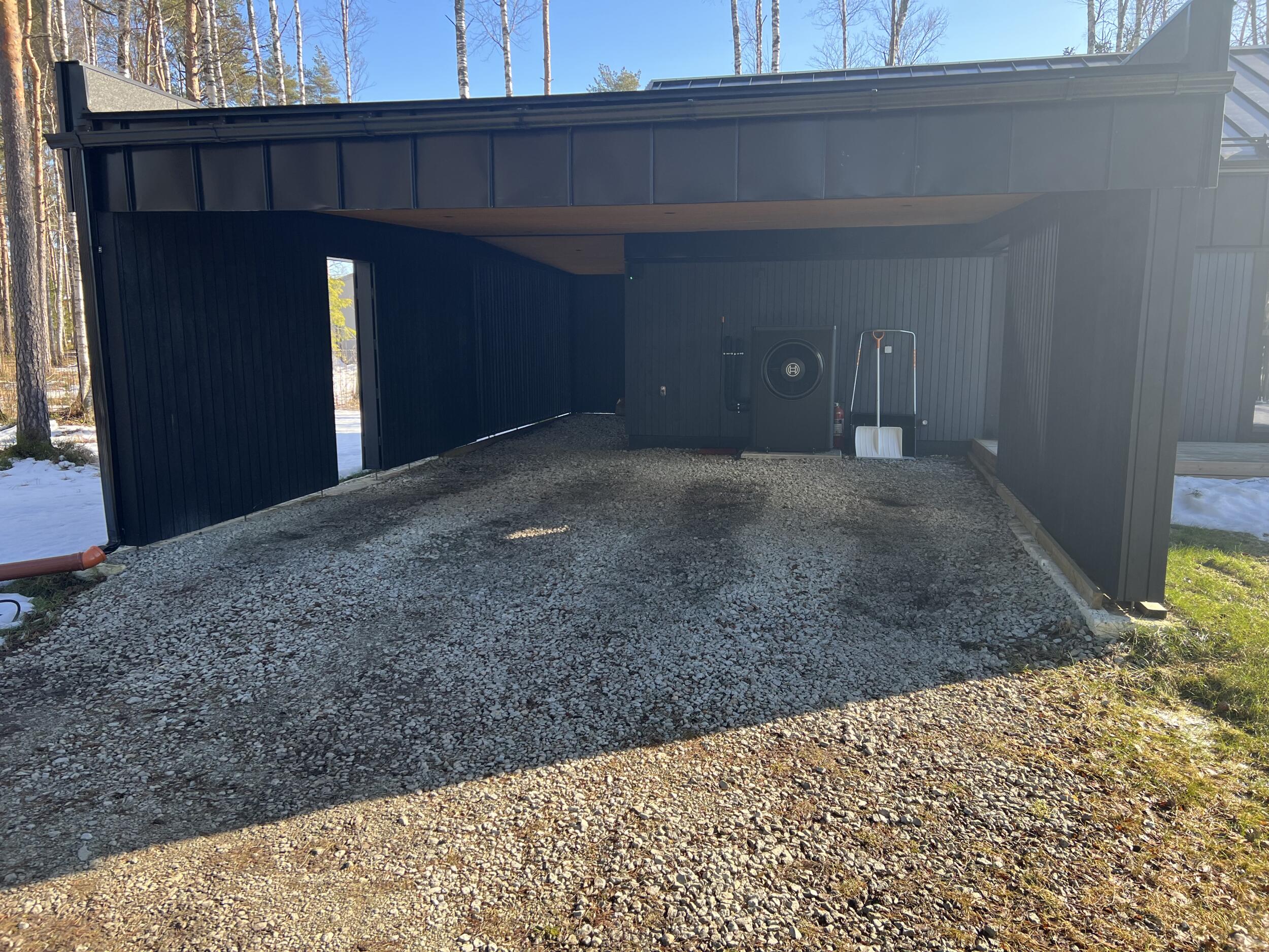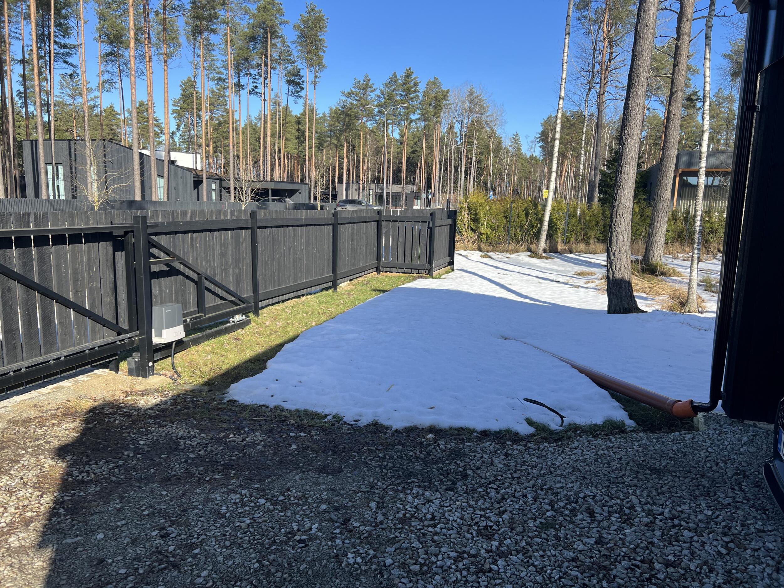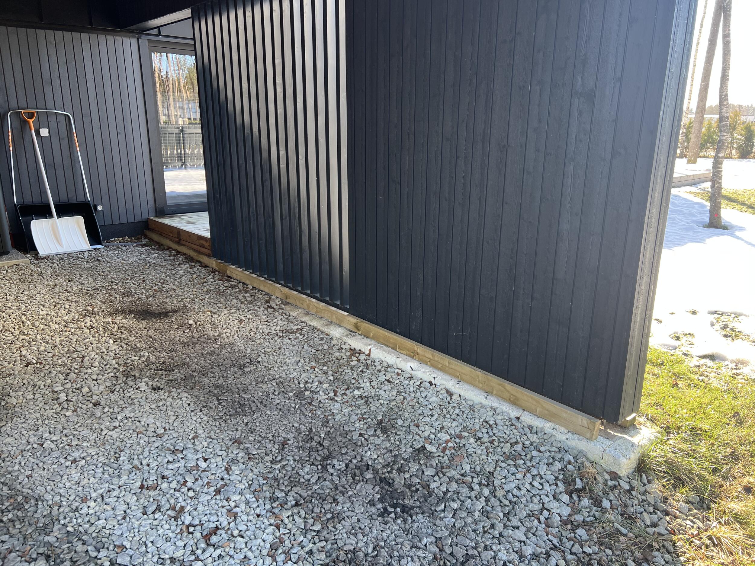 Aluspõhi on osaliselt tehtud auto varjualuse juures, aga ilmselt vaja uuesti üle teha. Ülejäänud pinnasel kasvab muru. Auto varjualuse juures on ka üks vihmaveetoru, mille sademed oleks vaja kivist renniga majast eemale suunata. Samuti peaks auto varjualuse kalded suunama tänava suunas või majast eemale. Hetkel on auto varjualuse juures lahtiselt varjualuse vundament ja penoplast, mis tuleks korralikult kividega katta (seda on ka piltidelt näha). Soojuspump liigutatakse tööde ajaks eest.