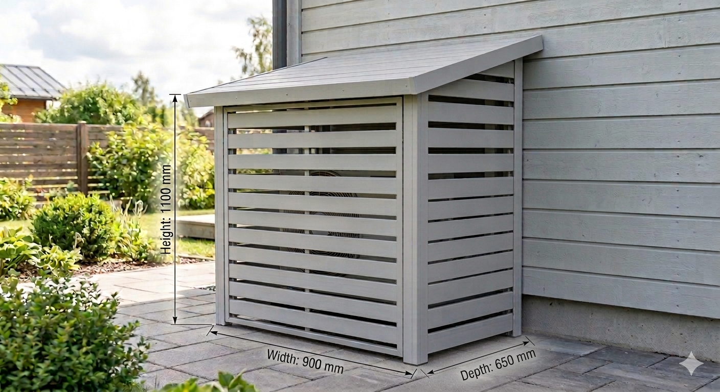 Ehitada 8 õhksoojuspumba välisosa katet (idee lisatud pildina) ja need paigaldada. Kate peaks olema nii väikeste mõõtudega kui pumba tööd arvestades võimalik, et esteetiliselt ilus jääks. Kaetud peaksid olema küljed ja esikülg (ribistik) ja pealt (katus võib olla pisut kaldus). Tagant võib olla lahti. Kate peaks olema vajadusel lihtsasti eemaldatav, et soojuspumbale ligi saaks.