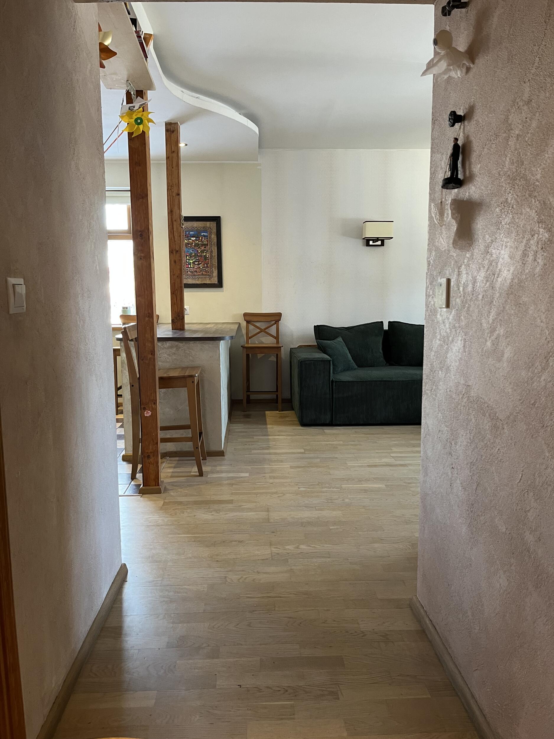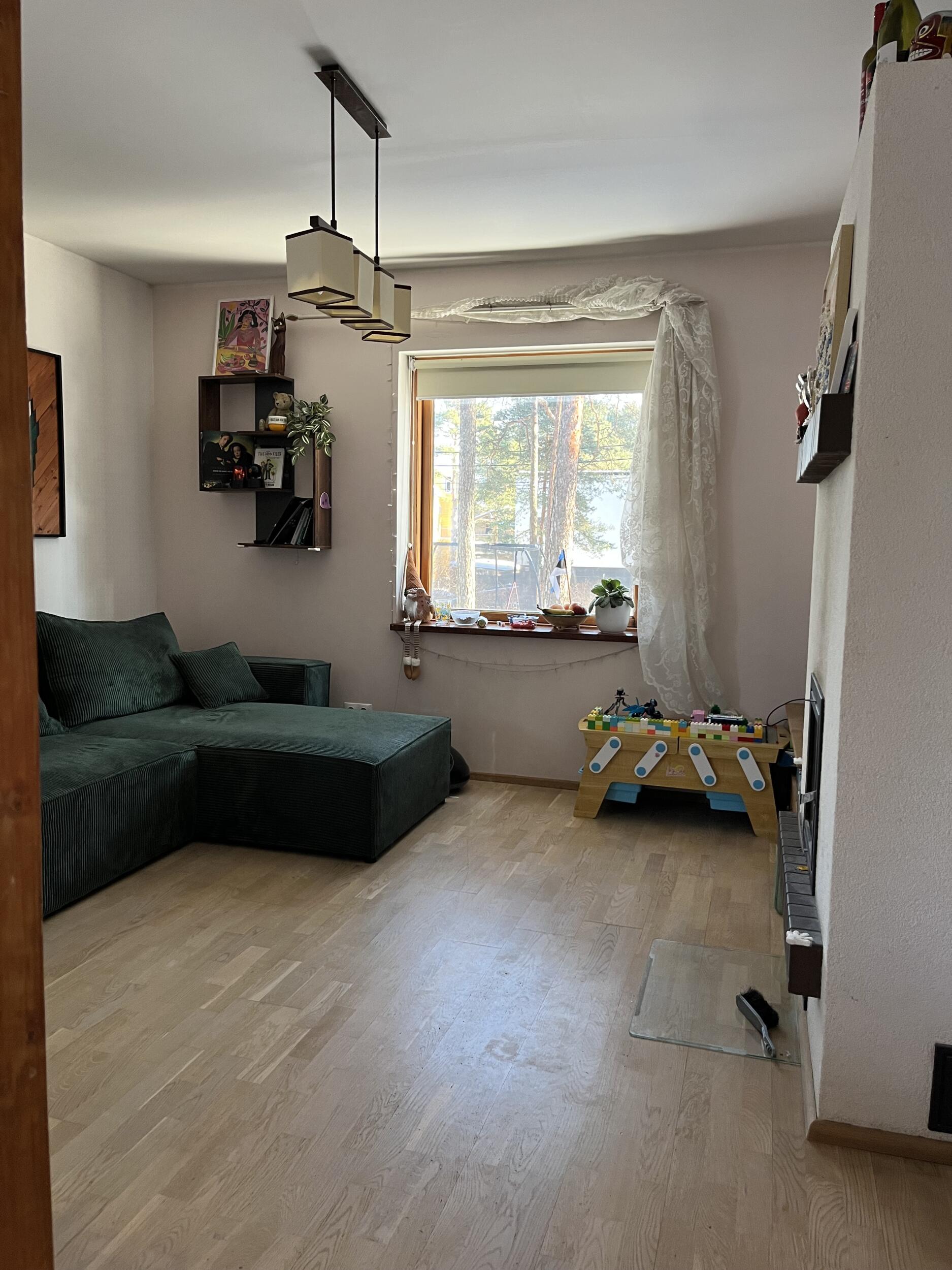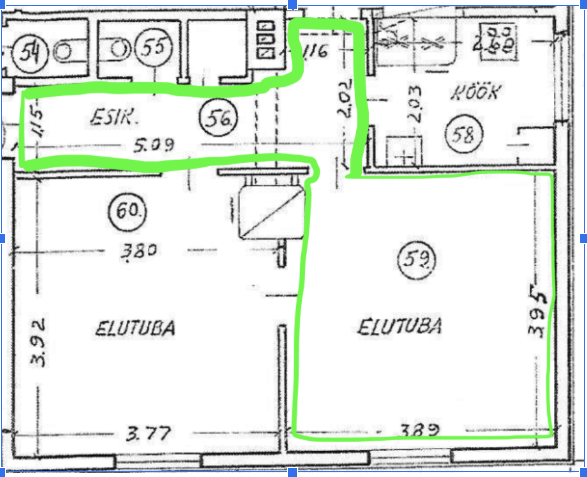 * Elutoas ja esikus eemaldada ja utiliseerida vana laminaatparkett ning paigaldada uus parkett. Pindala kokku 24 m2 (vt pildilt rohelisega piiritletud ala).