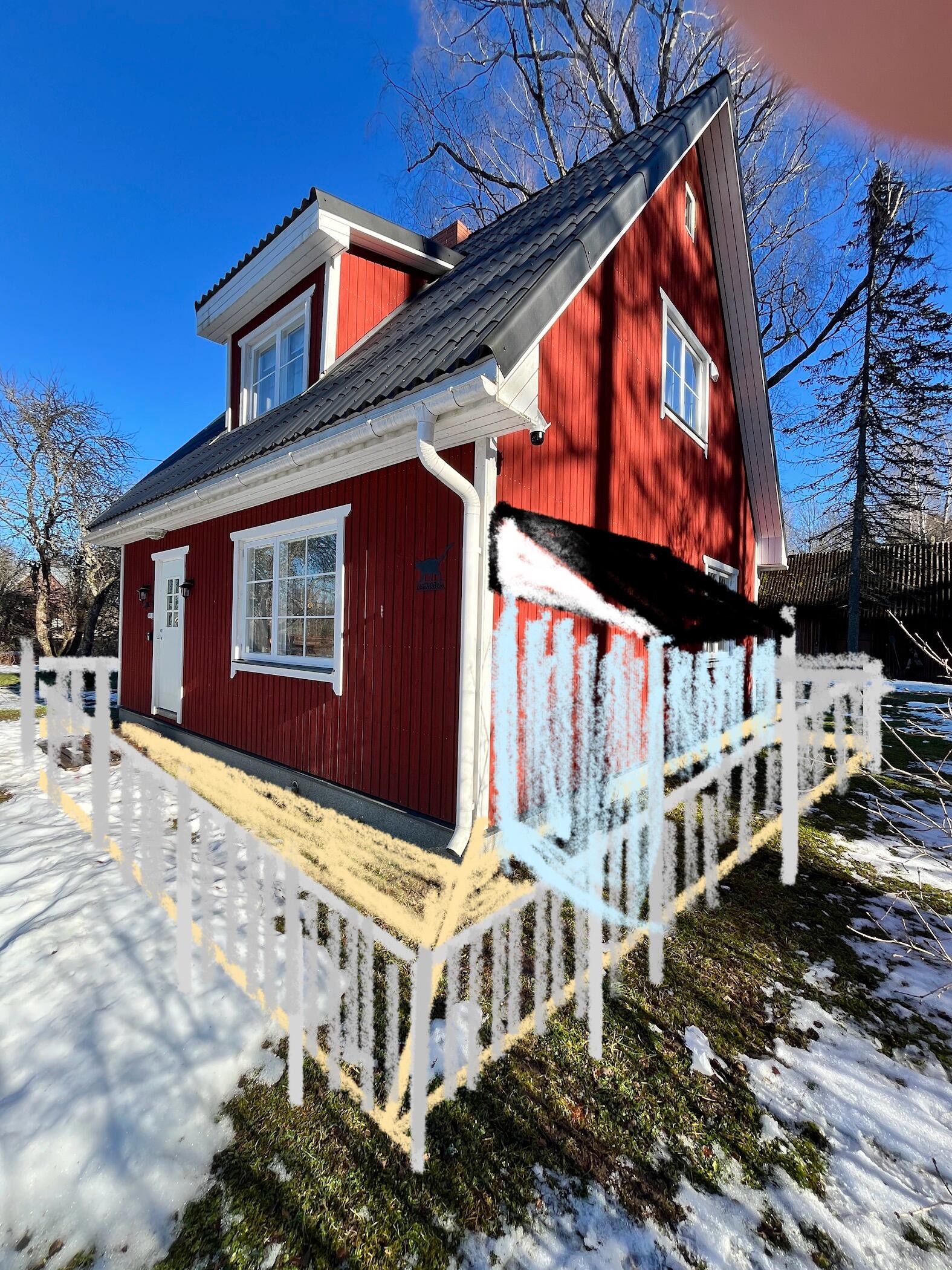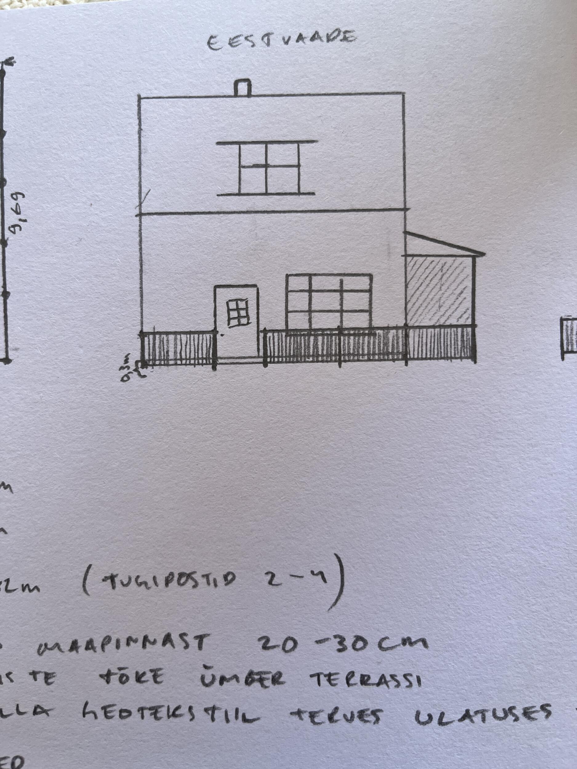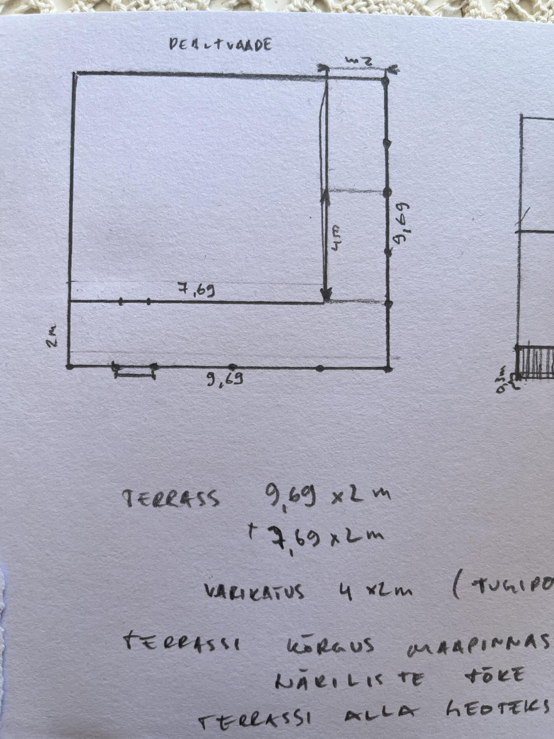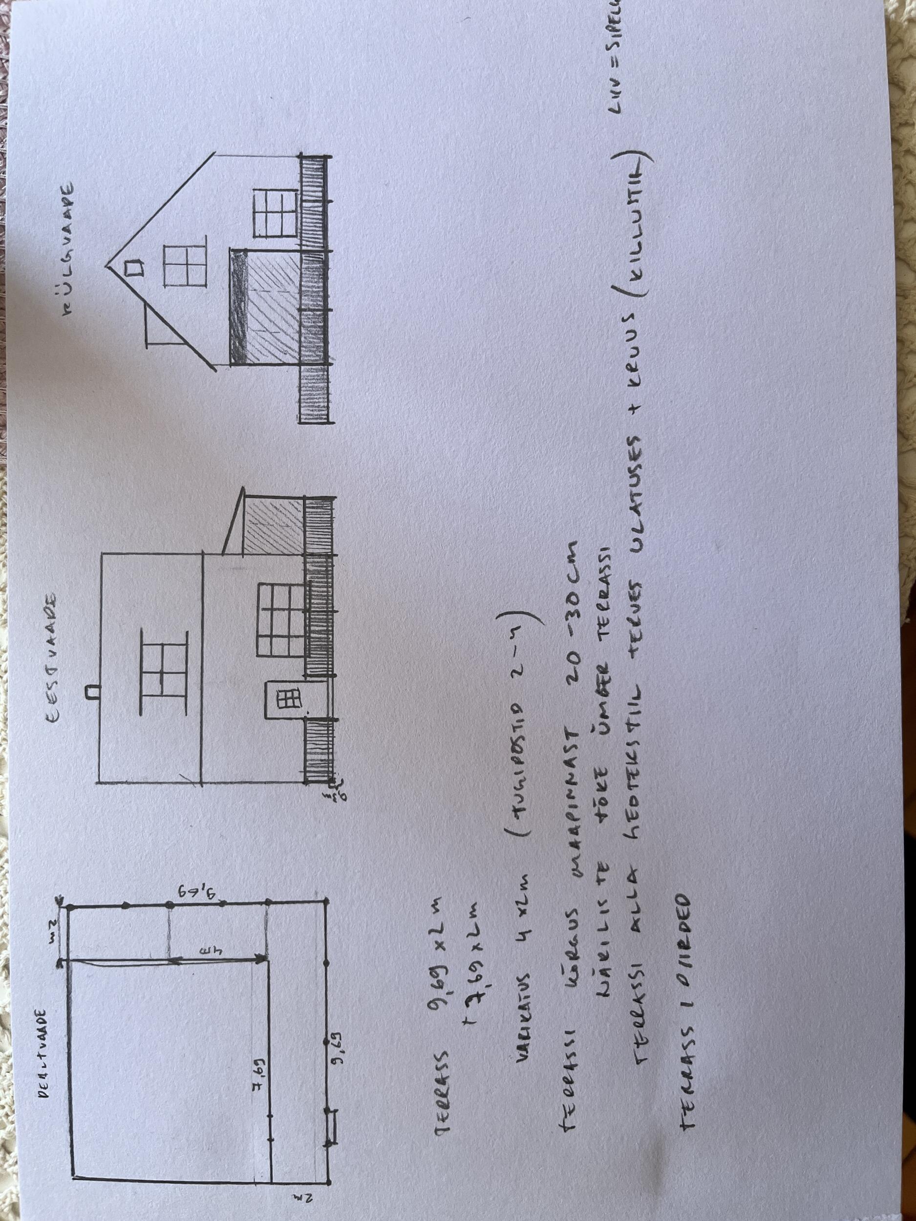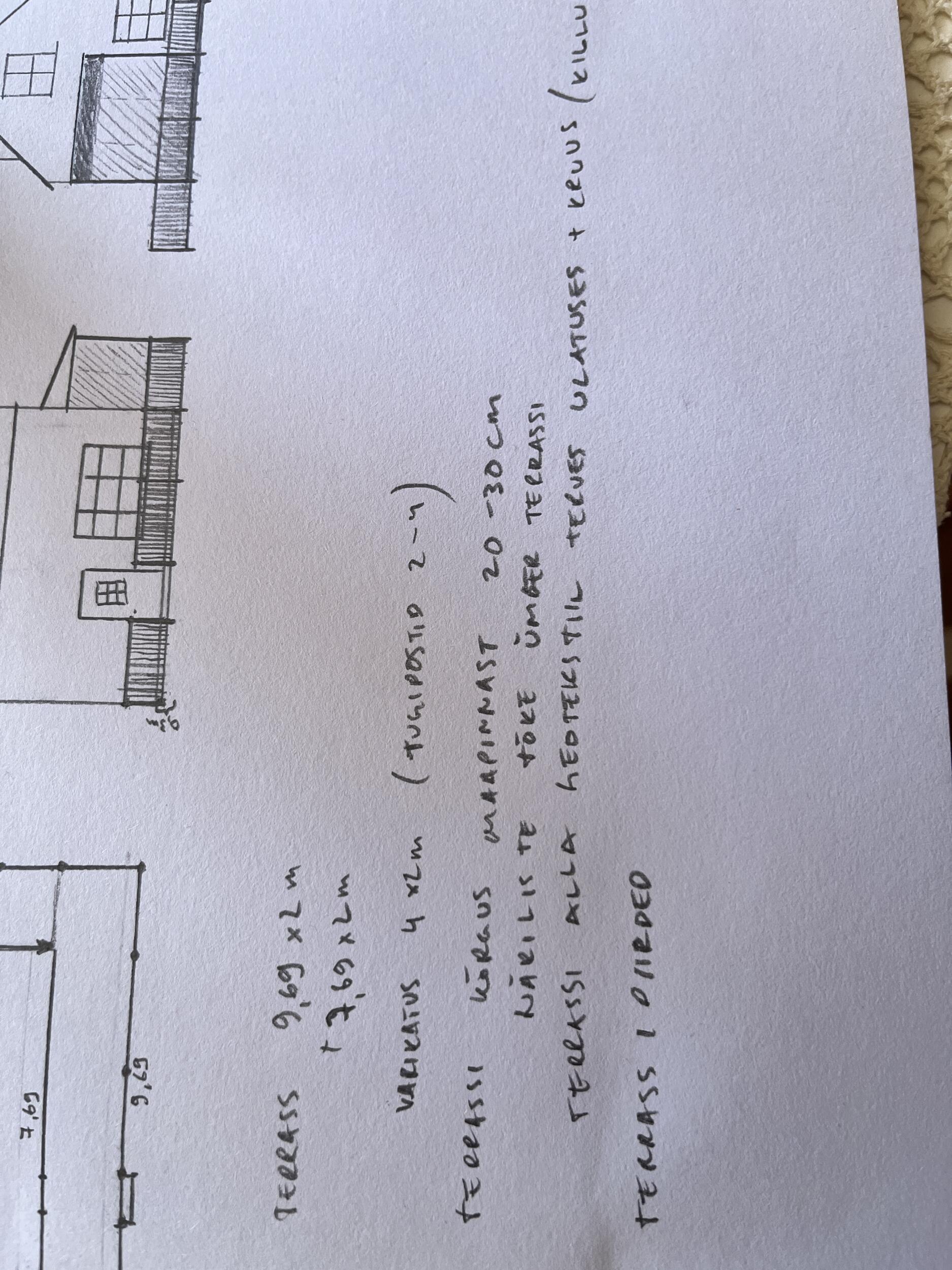 terrassi külgedele närilistevõrgusoov. Terrassipiirde kõrguseks standard, töödelda valgega, komposiitlauad (helehall) või spetsiaalselt töödeldud terrassilauad, avatud erinevatele variantidele. Sokli kõrguseks välisukse läveni mõõdetud u 30 cm. Terrassi pikkus väliskülgedest 2 x 9,69m, sisekülgedest 2x 7,69m, laius konstantselt 2 m.Pinnas on valdavalt liivane ja pehme, võib kasutada kruvivaiu vm lahendusi. kindlasti geotekstiil terrassi alla ja killustik, liiv toob kaasa sipelgad ja neid pole puitmajale vaja. Pakkumise võib teha ka ainult avatud terrassile ilma kinnise osata ( katusealune klaasist talveterrass) .
