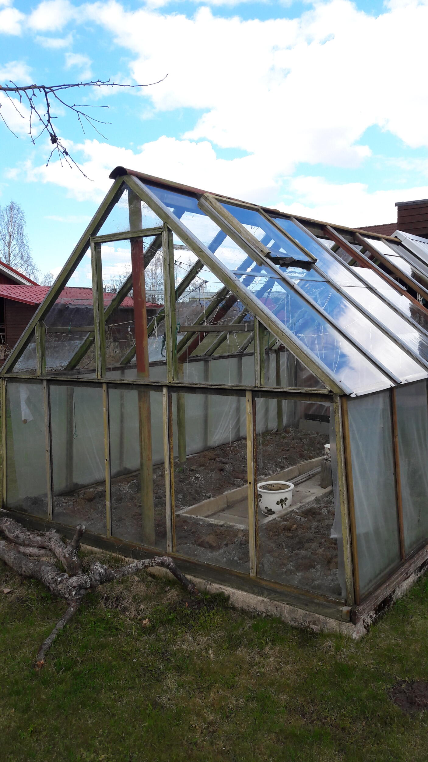 Mul on kasvuhoone, mis on aastakümneid vana. Puidust karkassi osa on valdavalt mädanenud. Ent kasvuhoonel on ka rauast suuremad talad. See tähendab, et saab vast kapitaalremonti teha lihtsalt. Et pole vajalik uut ehitada. Vanad klaasid on osaliselt katki. Ilmselt peaks vahetama plastmasspaanide vastu. Oleme ise lappinud, aga võtaks ette tõhusama remondi. Kasvuhoonel on ees korralik remonditud eesruum - see jääb alles.