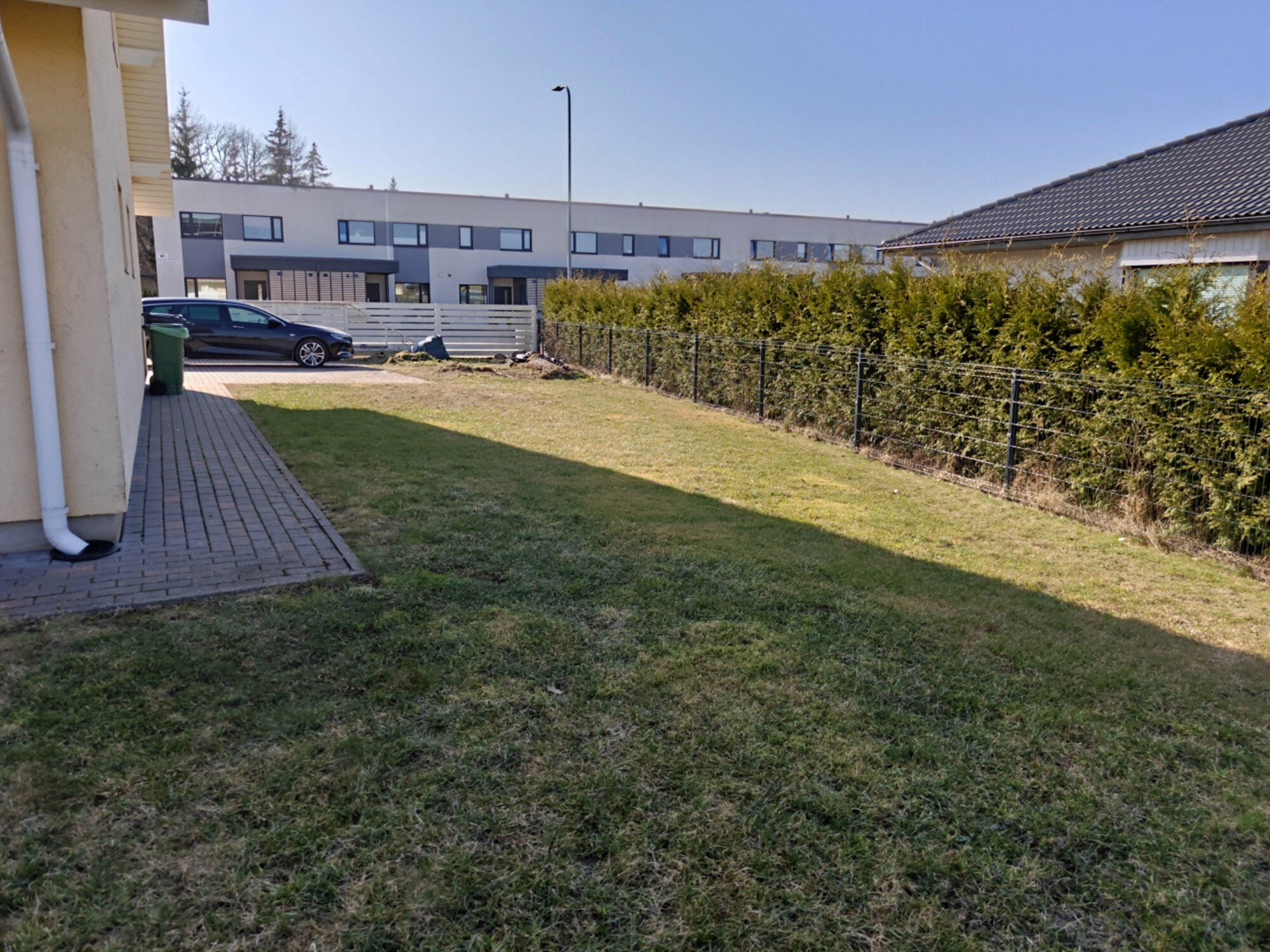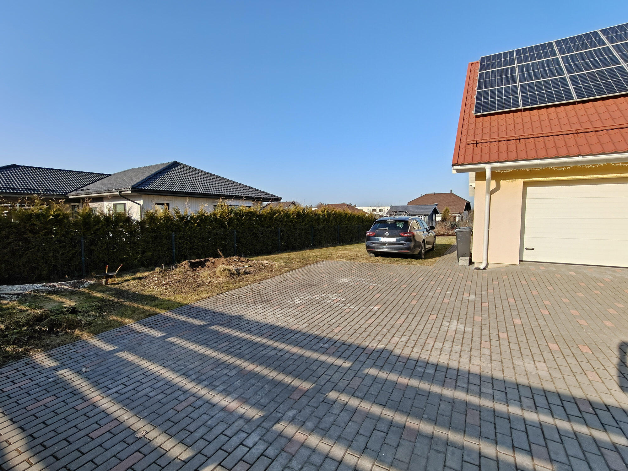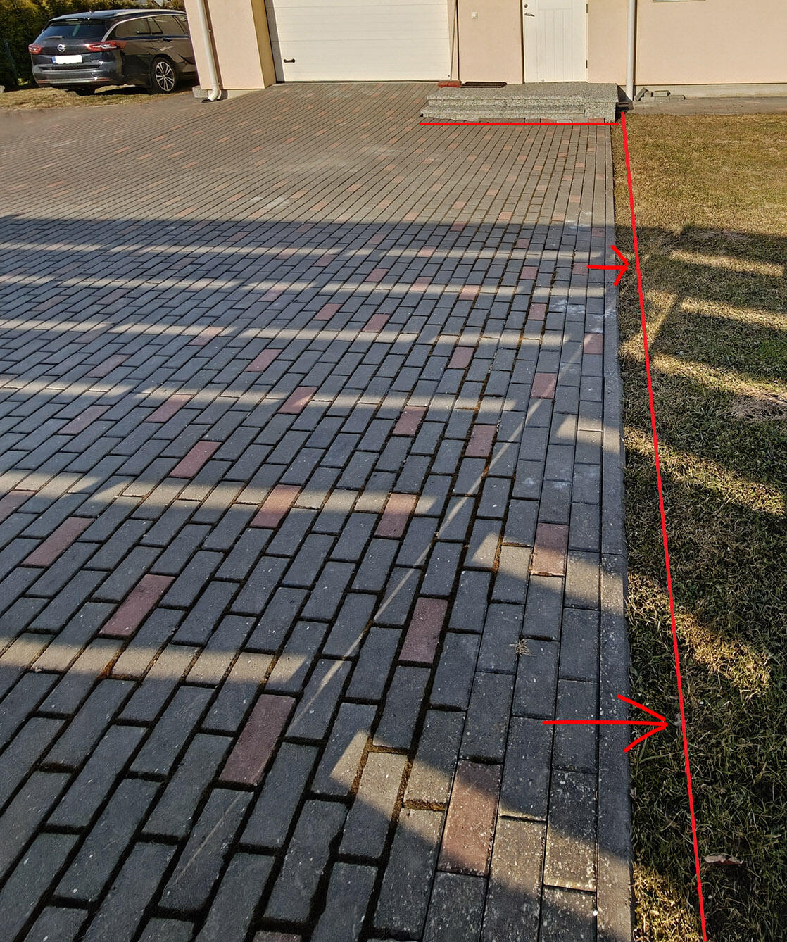 - Olemasolev kivisillutis (pildil halliga) üles võtta, alus tasandada/taastada ja kaldeid pisut muuta trepi ja garaažiukse ees, kivid tagasi laduda.