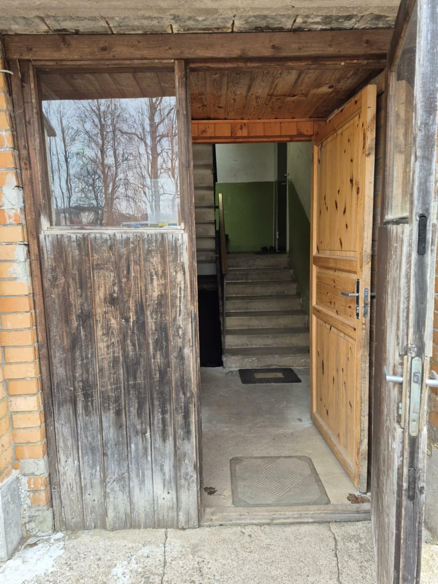 Vahetada tuleb kahe trepikoja välisuksed. Kahepoolne välja avanev. Parem käsi. Kõrgus 220cm, laius 163cm. Vanade uste utiliseerimine.